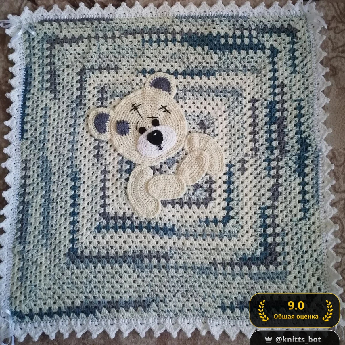 Очаровательный детский плед-комфортер, связанный крючком в технике «бабушкин квадрат», украшён объёмной аппликацией милого мишки Тедди. Мягкая меланжевая пряжа в нежных кремовых, серых и голубых оттенках образует красивый градиент по спирали квадрата. Ажурная кайма из пико по периметру придаёт работе воздушность, а атласные бантики в углах добавляют праздничности. Центральный медвежонок выполнен из плотных столбиков без накида, ушки и лапки аккуратно пришиты, мордочка вышита. Вся композиция выглядит очень уютно и идеально подходит для малыша – плед можно использовать и как покрывало, и как игрушку для сна.