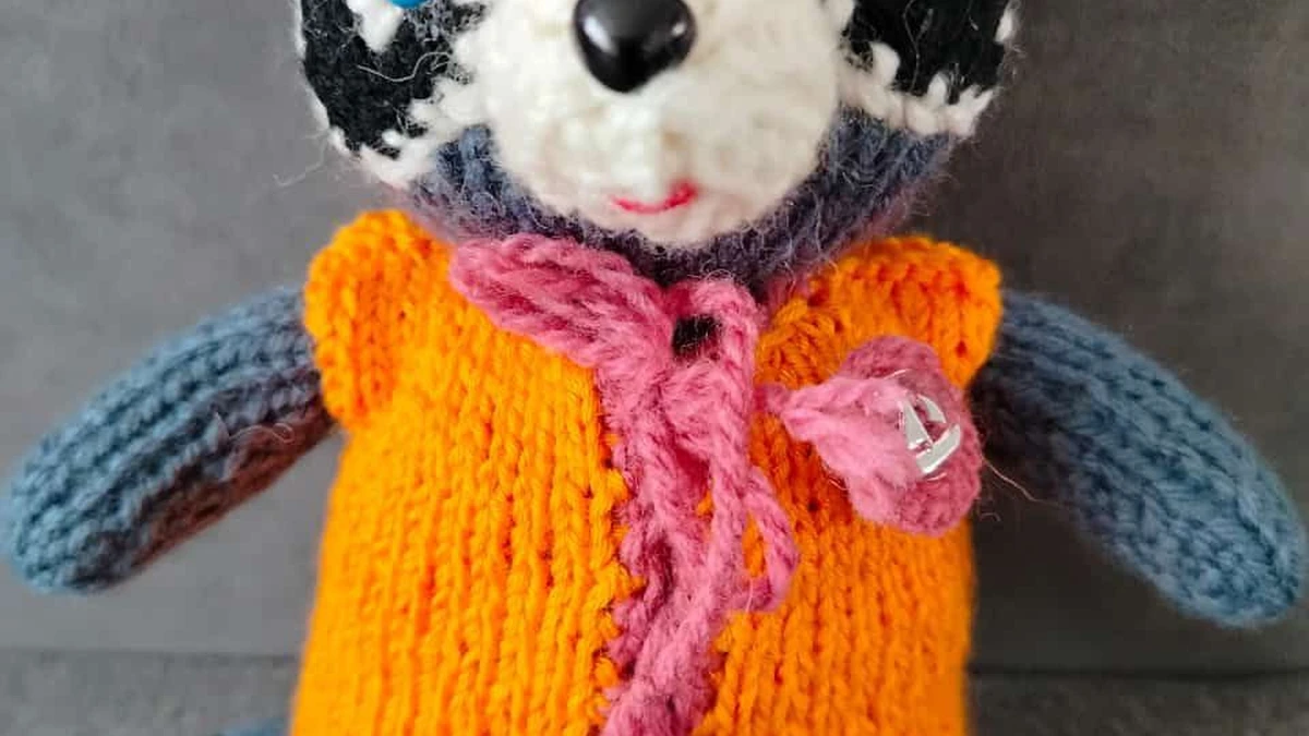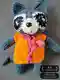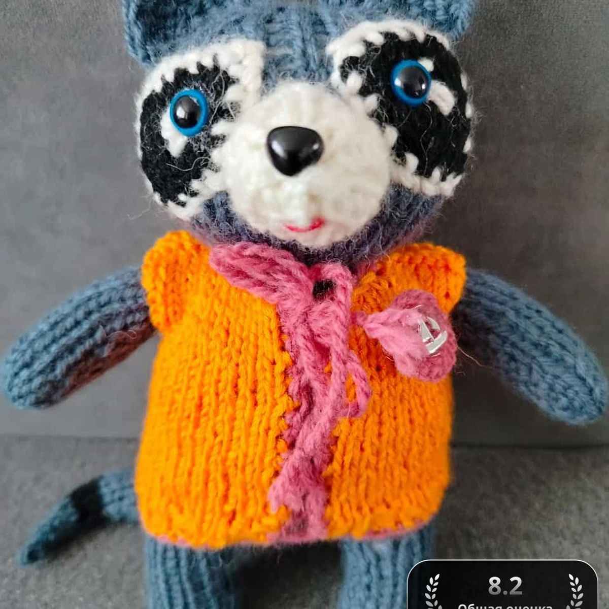 Эта очаровательная вязаная игрушка выполнена в виде енота, с милыми ушками и выразительными глазами. Яркий оранжевый жилет с розовым шарфиком придаёт особый шарм и привлекает внимание. Детали, такие как полоски на мордочке и милый хвост, выполнены с хорошей проработкой, делая игрушку особенно привлекательной для детей.