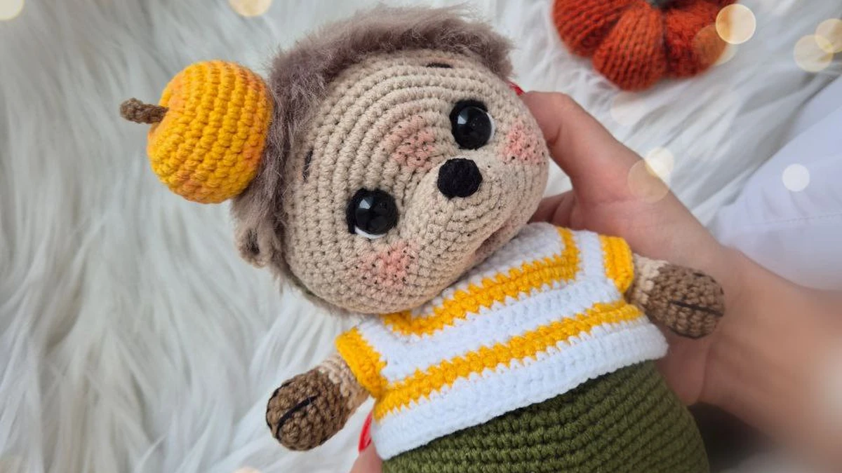 Очаровательный плюшевый ежик-малыш в стиле амигуруми сразу покоряет сердечки! Тельце связано ровными плотными столбиками без накида, мордочка выделена утяжкой и тонировкой, что придаёт трогательное выражение глазкам-пуговкам. Пушистый «околоток» из искусственного меха имитирует колючки, делая игрушку ещё более реалистичной, но совершенно безопасной. Яркий полосатый жилетик в бело-горчичной гамме и свободные оливковые штанишки привносят нотку ретро-стиля. Забавная мини-тыква на макушке поддерживает осеннее настроение и гармонирует с двумя вязанными тыковками-декорациями на заднем плане, подчёркивая тематическую композицию.