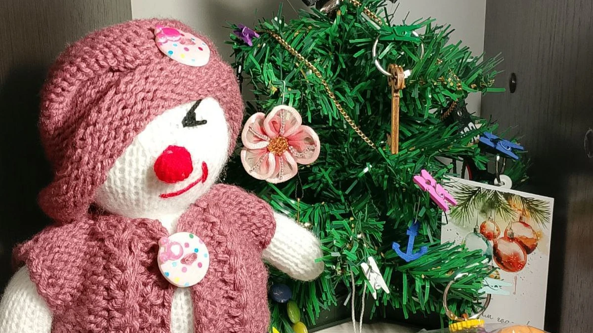 Замечательная вязаная игрушка-снеговик украшена стильной розовой шапочкой и жилеткой, при этом она прекрасно дополнена елочкой с украшением и небольшими декоративными элементами.