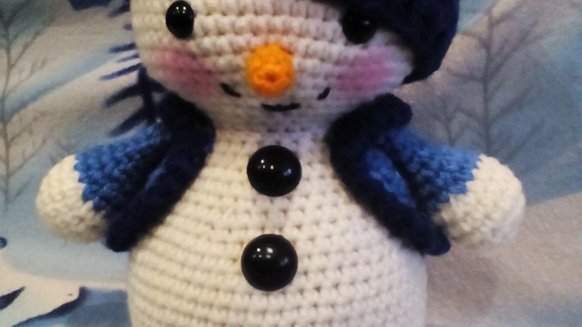 Этот очаровательный снежный человечек выполнен в технике амигуруми. Он идеально подходит, чтобы добавить зимнего настроения в ваш дом. Его мягкая, пухлая текстура делает его идеальным компаньоном для холодных зимних вечеров. Наряженный в милую синюю шапочку и жилет, он будет отличным подарком для детей и взрослых.