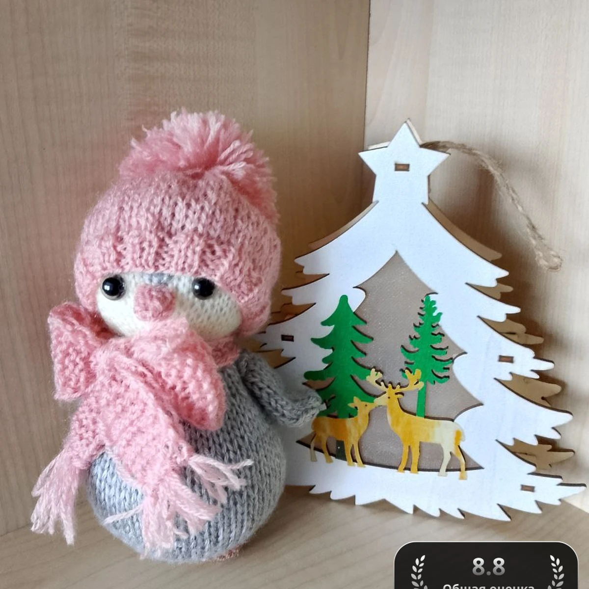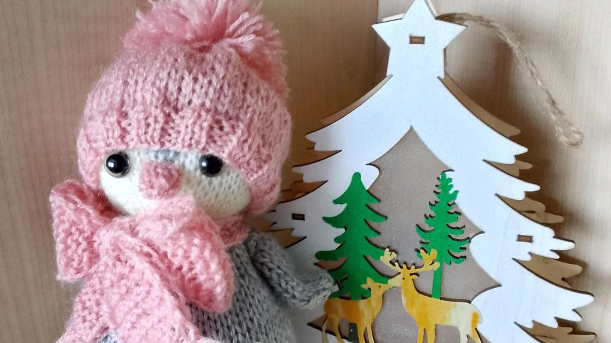 На фото — очаровательная небольшая вязаная игрушка в зимнем образе: серое тельце выполнено лицевой гладью, мордочка светлая, с аккуратно пришитым розовым носиком и чёрными глазками. Особый шарм дают нежно‑розовые аксессуары: шапочка с помпоном и объёмный пушистый шарфик с бахромой — они добавляют «уютности» и делают образ очень фотогеничным. Рядом стоит декоративная новогодняя ёлочка с оленями, что красиво подчёркивает сезонную тему и делает композицию праздничной.