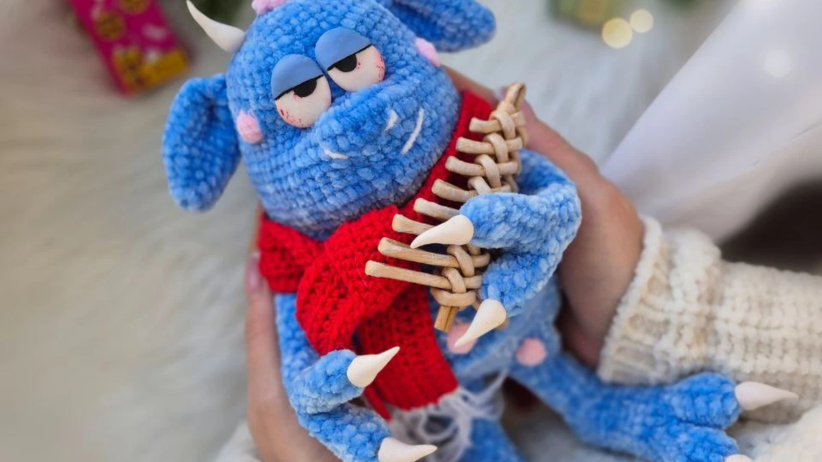 На фото — очаровательный плюшевый амигуруми-монстрик в небесно‑голубом цвете: мягкая фактура синели даёт «пушистую» поверхность и очень уютный вид. Выразительные полуприкрытые глазки с веками создают характер (соня/ворчун), а маленькие рожки и коготки добавляют игривой «монстрячести». Яркий красный шарфик связан отдельно и отлично контрастирует с голубым. В лапках — забавный аксессуар «рыбья кость», который делает сюжет и фото живыми. Снимок тёплый, с красивым боке и новогодним настроением — изделие читается сразу и выглядит подарочно.