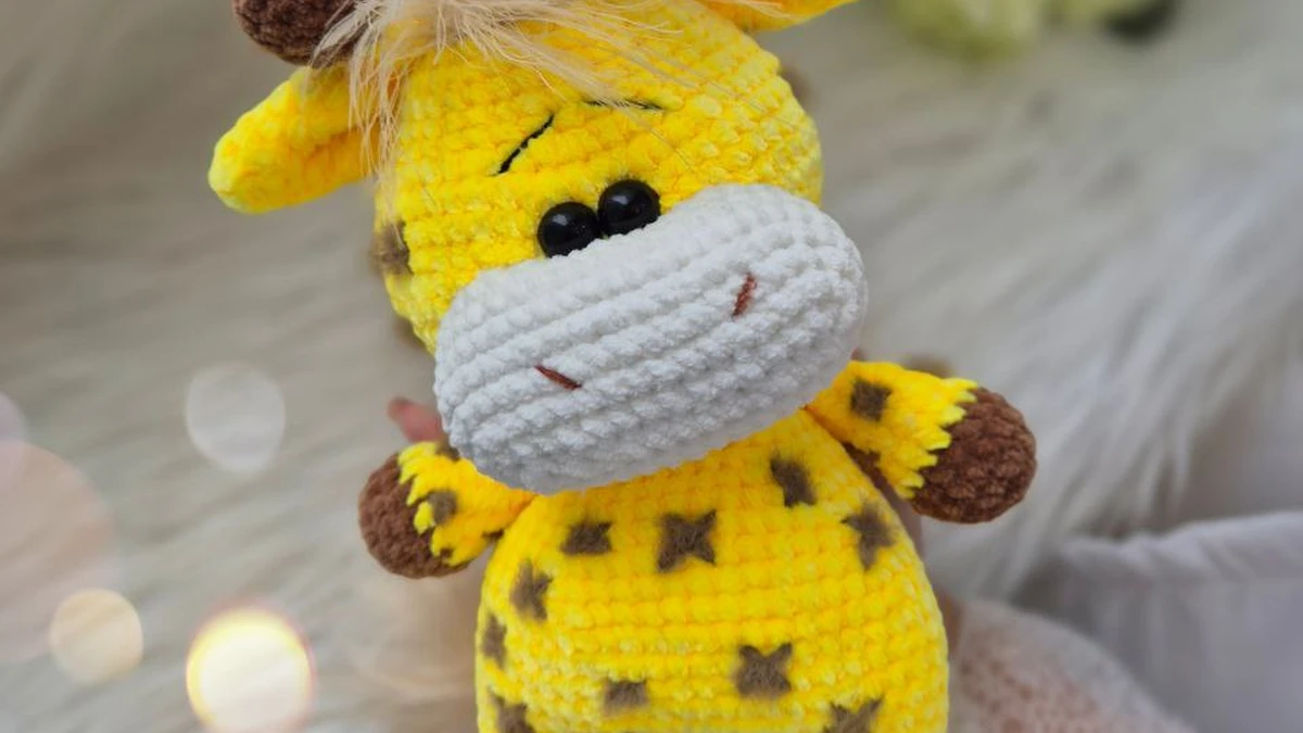 Очаровательная плюшевая жирафка амигуруми, связанная крючком из ярко‑жёлтой синельной пряжи с коричневыми пятнышками. Очень милое выражение мордочки: объёмная белая «мордочка», аккуратные чёрные глазки и вышитая улыбка. Детали хорошо читаются: рожки, ушки, хвостик с пушистой кисточкой и маленькая чёлка придают игрушке характер. Фото удачное: мягкий свет, красивое боке, игрушка в фокусе и выглядит «живой».