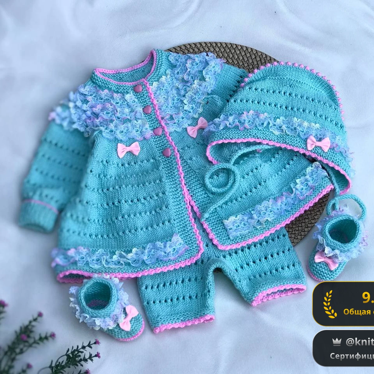 На этой фотографии представлен изумительный комплект для малышей, выполненный крючком. Комплект состоит из жакета с круглой кокеткой, уютных брючек, аккуратной шапочки и двух пинеток. Все детали украшены нежной рюшей и милыми розовыми бантиками, придавая изделию нарядный и праздничный вид. Базовый цвет — свежий голубой, идеально сочетающийся с декором. Такой комплект станет отличным подарком для новорожденной малышки или ее мамы, подчеркнет трепетное отношение к деталям и заботу о ребёнке.
