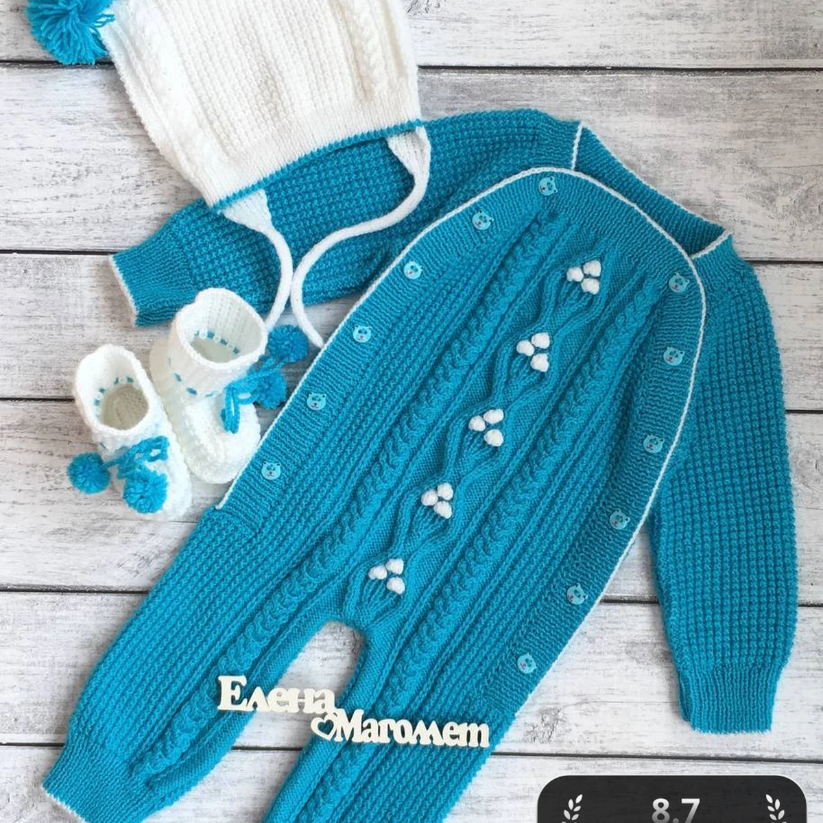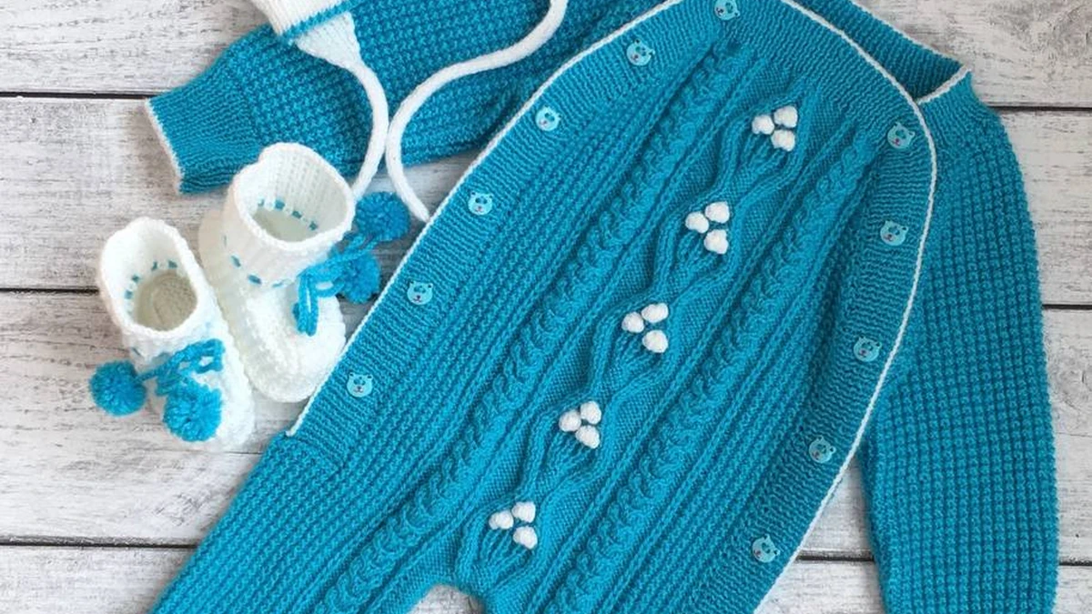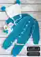 Комбинезон выполнен классическими спицами, основным узором является полупатентная резинка. Особенное внимание уделено украшению передней части комбинезона – здесь использованы косы и объёмные элементы в виде маленьких белых помпонов, которые расположены симметрично. Это придаёт изделию уникальный и интересный вид. Шапочка также связана спицами, с использованием жаккардовых приёмов для создания белых узоров, которые хорошо контрастируют с основным голубым цветом. Завершает её образ два больших помпона, которые придают изделию игривость и лёгкость. Пинетки сделаны с использованием простого лицевого вязания, что позволяет им быть мягкими и уютными для детских ножек. Они украшены шнурками с помпонами для удобства фиксации и добавления декоративного элемента.