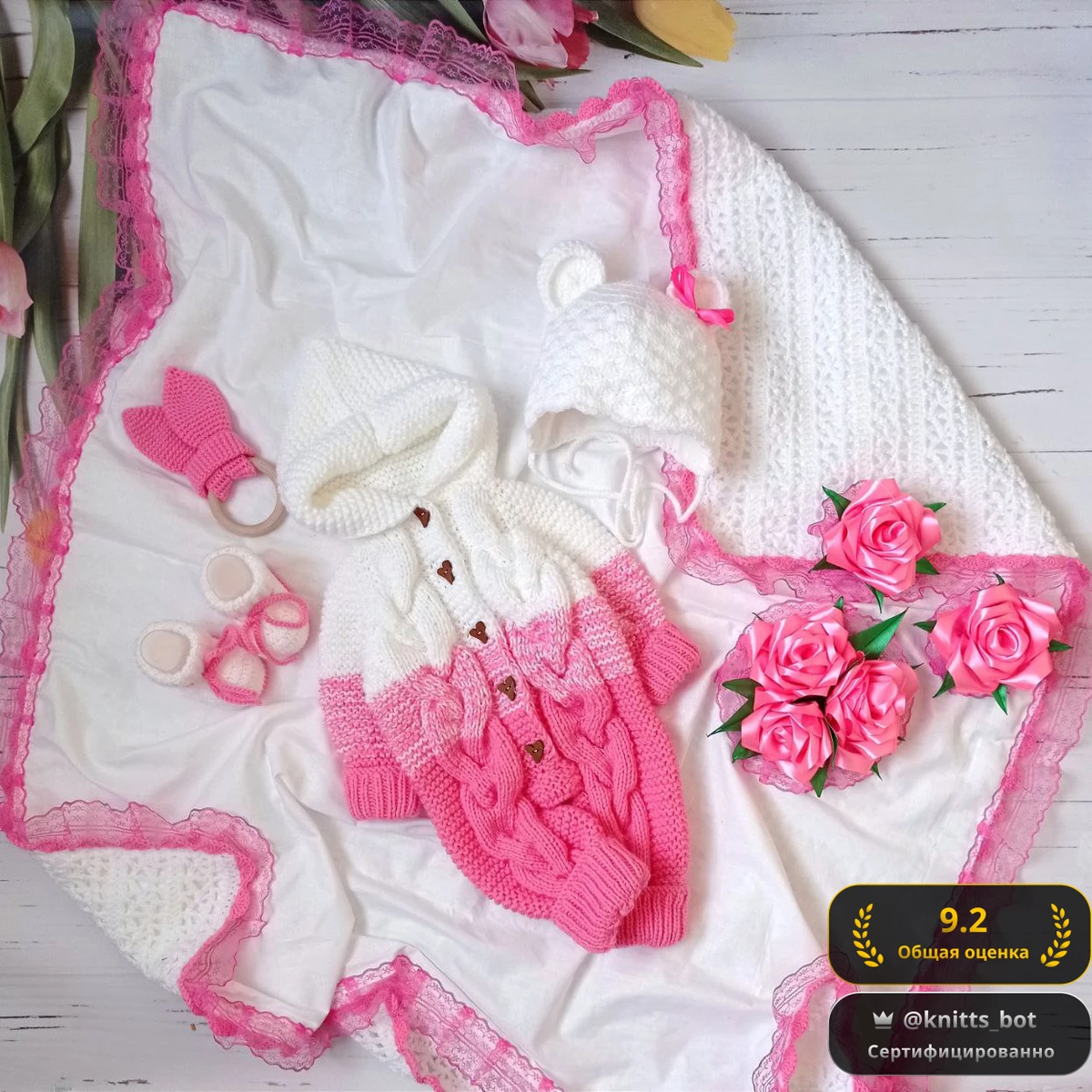 Очаровательный комплект для новорождённой принцессы: уютный комбинезон-плед «омбре» от молочно-белого к клубнично-розовому, украшенный крупными аранами, мини-сердечками-пуговками и мягкой капюшон-каплей. В пару — шапочка с медвежьими ушками, вывязанная мелким рельефным узором «рис», варежки-царапки на деревянном колечке-грызунке и пинетки, повторяющие цветовое решение. Дополняет ансамбль ажурный плед с кружевной оборкой в тон розовой каймы. Всё выглядит гармонично, нежно и очень фотогенично — идеальный «выписной» или первый фотосет малыша!