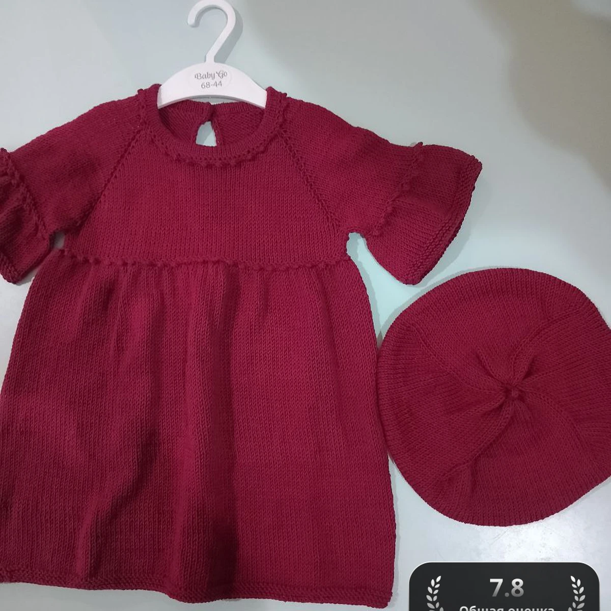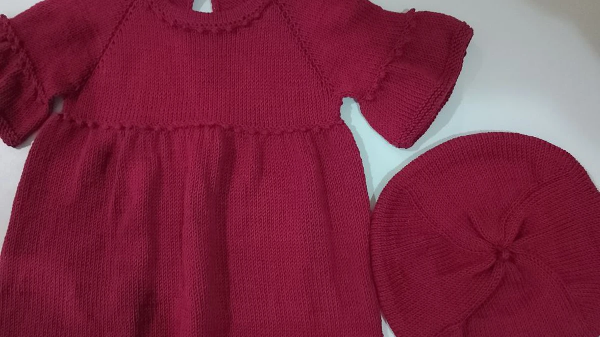 Это прелестное детское платье с круглым воротником и рукавом реглан, сопровождаемое подходящей шапочкой. Цвет глубокий и насыщенный, что делает комплект стильным и элегантным. Такая работа подойдет для особых случаев или повседневной носки.