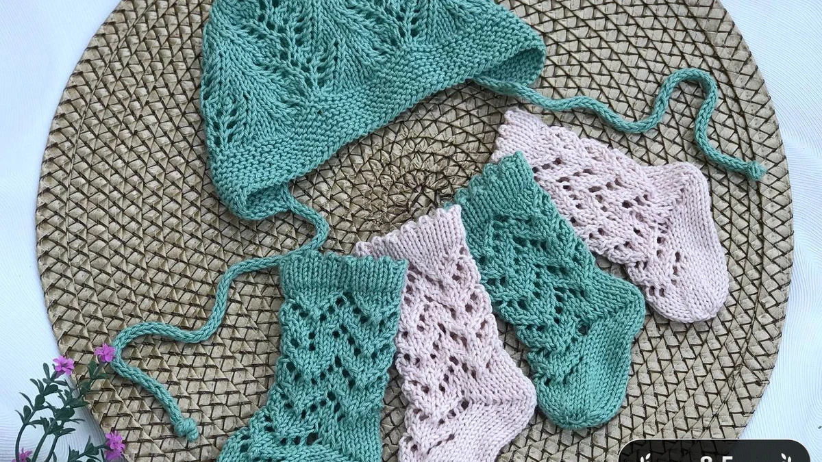 Комплект выполнен с использованием техник кругового вязания и вязания на четырех спицах. Шапочка связана по кругу, без швов, благодаря чему она выглядит аккуратно и красиво ложится по голове. Основной узор – ажурная резинка с элементами листьев, которая создаёт интересный рельеф и добавляет игривости изделию. Для пинеток использована техника вязания с фиксированным набором петель, а также метод «укороченные ряды» для формирования части обуви. Ажурный узор повторяет узор шапочки, что гармонично объединяет комплект. Пряжа выбрана нежной и гипоаллергенной, идеально подходящей для детских вещей. Каждое изделие завершается аккуратной обработкой краев и завязками, что обеспечивает надёжное крепление и комфорт при ношении. Это позволяет не только улучшить внешний вид изделий, но и делает их максимально удобными.