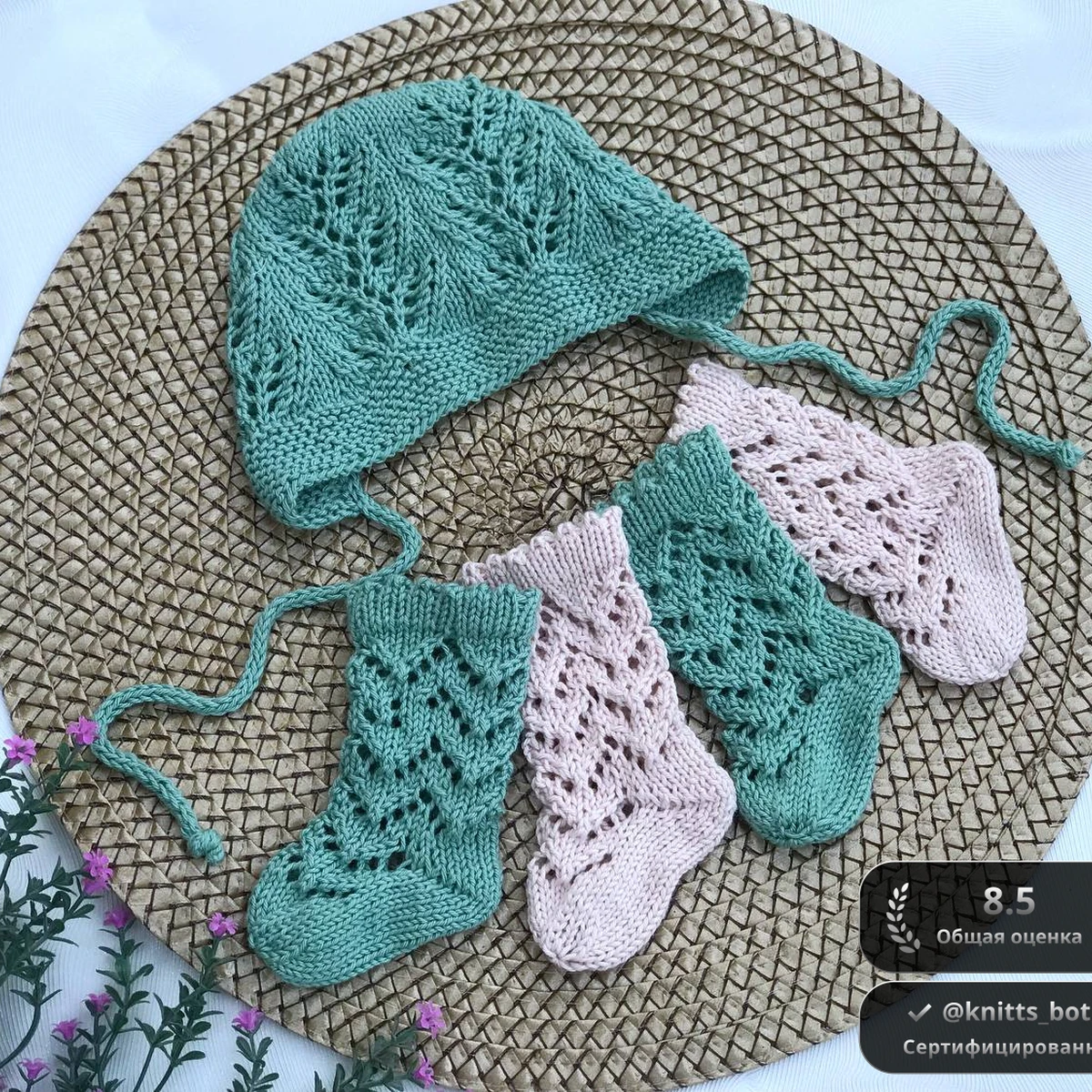 На фото представлена очаровательная вязаная шапочка и пара пинеток. Этот комплект выполнен из мягкой хлопковой пряжи и сочетает в себе нежные цвета - оттенки мяты и розового. Шапочка имеет красивые ажурные узоры, что придаёт ей лёгкость и воздушность. Пинетки выполнены в том же стиле, что объединяет их в прекрасный сет.