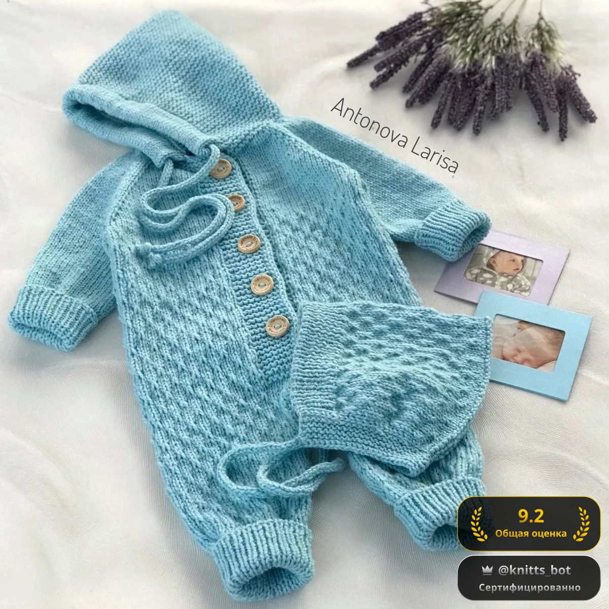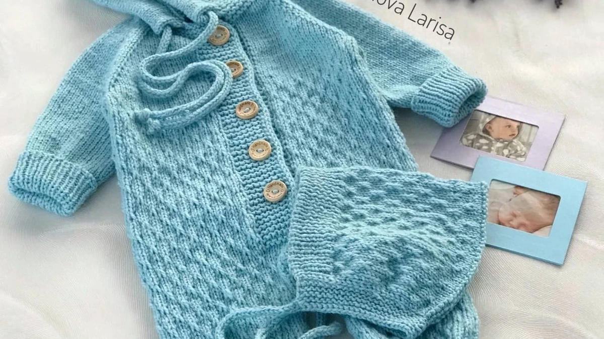 Какое очаровательное нежно-голубое чудо! На фото мы видим уютный детский комбинезон с капюшоном и аккуратными деревянными пуговками, дополненный милой шапочкой-боннетом. Рельефный узор сотами дарит интересную текстуру и воздух, а плотные резинки по манжетам и ножкам обеспечивают идеальную посадку и тепло. Капюшон связан платочной вязкой, благодаря чему отлично держит форму и подчёркивает мягкие детские черты. Сдержанная пастельная палитра создаёт ощущение легкости облачка, а аккуратная фотокомпозиция с веточками лаванды и снимками малышей придаёт работе тёплое, домашнее настроение.