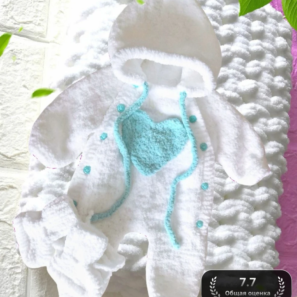 Очаровательный плюшевый комбинезон-человечек для новорождённого выполнен из мягчайшей белой микрополиэстеровой пряжи, которая превращает изделие в пушистое облачко. Центр композиции — бирюзовое объёмное сердечко и аккуратные тонкие завязки того же цвета, придающие образу трогательность и нежный акцент. Капюшон с нежной обвязкой защищает головку малыша, а ряд бирюзовых пуговок делает переодевание быстрым и удобным. К комплекту прилагаются пинетки-носочки, связанные в той же технике и гармонично дополняющие ансамбль. Текстура крупных плюшевых петелек дарит дополнительное тепло и делает вещь бархатистой на ощупь. Изделие смотрится празднично и фотогенично, несмотря на слегка перебор с декоративными листьями в кадре.