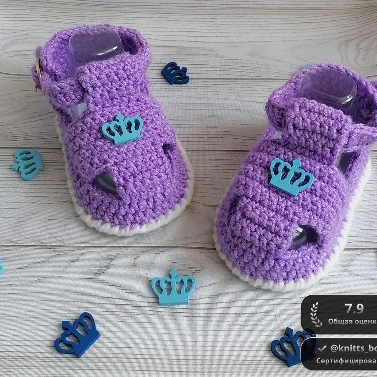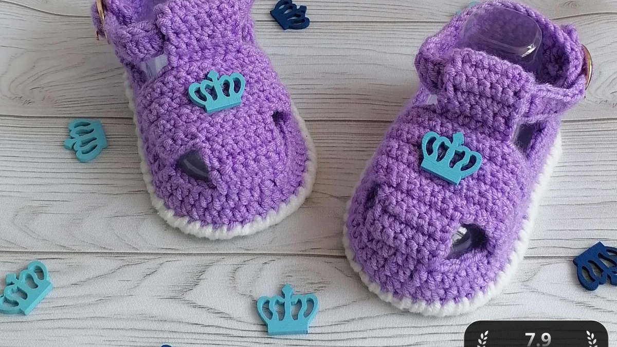 Модель выполняется крючком №2–2,5 по классической схеме анатомической подошвы для новорождённых. Сначала вяжётся овальное основание: цепочка воздушных петель замыкается в кольцо, далее провязываются три овальных ряда столбиками без накида с равномерными прибавками на мыске и пятке. Чтобы подошва оставалась пластичной, используется приём смены плотности: за задние полупетли в центральной части и за обе стенки по периметру. После вывязывания подошвы переходят к боковой стенке, поднимая ряд за заднюю дужку, что создаёт аккуратный кант. Стенки формируются двумя рядами столбиков без накида, затем вывязываются боковые прорези: петли пропускаются и замещаются воздушными, создавая отверстия для вентиляции. Центральная перемычка провязывается отдельно столбиками без накида и соединяется с основанием методом соединительных столбиков. Пяточная часть формируется укороченными рядами: в каждом втором ряду оставляют по две петли непровязанными, постепенно поднимая высоту. Ремешок вывязывается из той же пряжи, закрепляется на боковой стенке и снабжается мягкой застёжкой-пуговкой. Край полотна обвязывается рачьим шагом для усиления износостойкости. В завершение пришиваются декоративные пластиковые коронки. Все нитяные концы заправляются иглой по изнанке, затем изделие отпаривается через ткань.