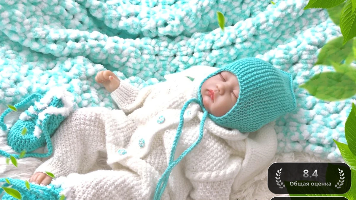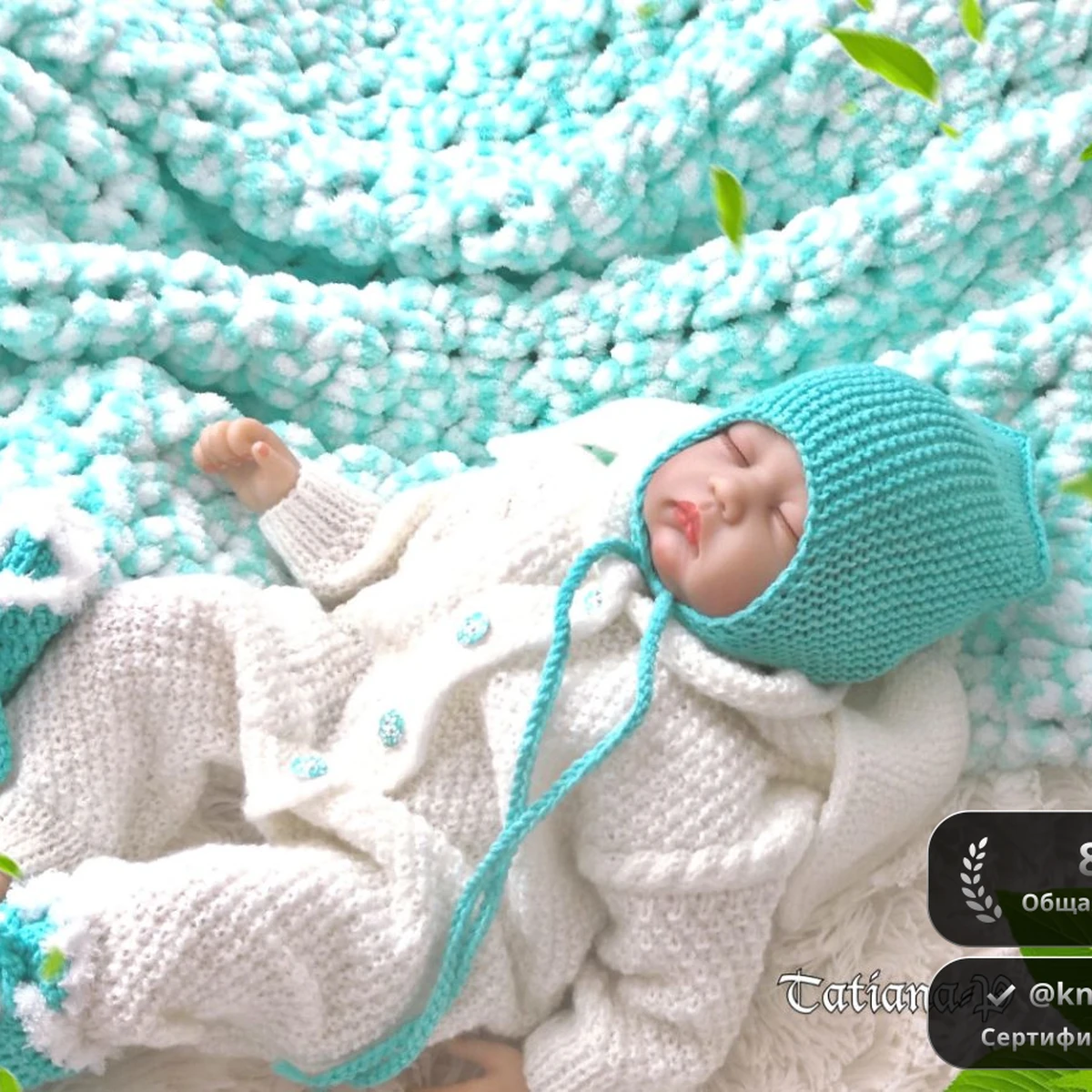 На фото изображены очаровательные детские вязаные изделия, включая шапочку, пинетки и комбинезон. Эта нежная коллекция выполнена в пастельных тонах, которые придают изделию мягкость и уют. Шапочка плотно облегает голову малыша, а комбинезон и пинетки хорошо сочетаются с основным дизайном. Одеяльце на заднем плане добавляет тепла и завершает композицию.
