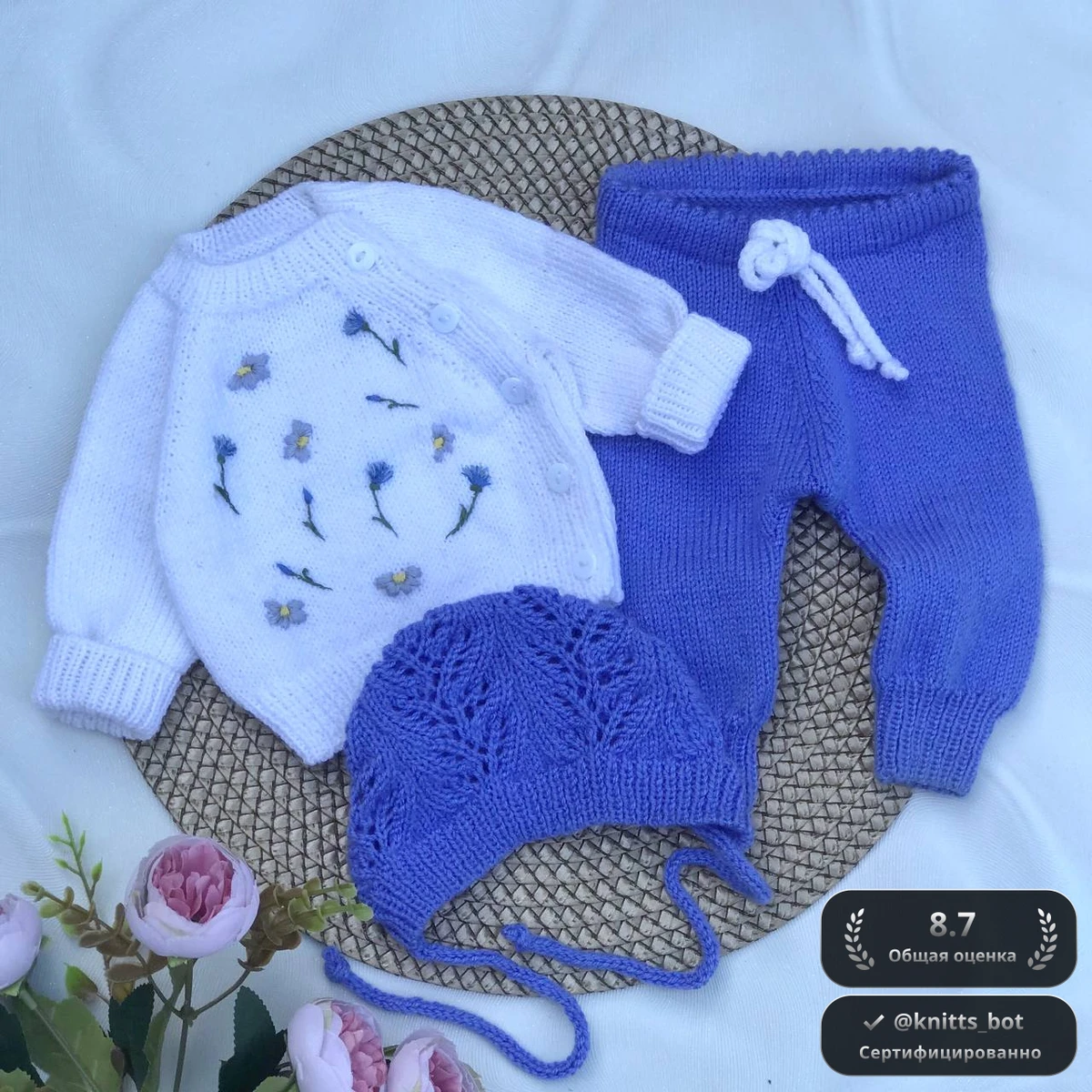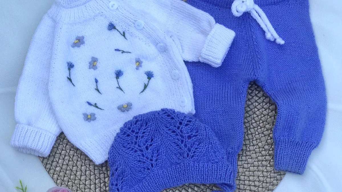 Нежнейший комплект для малыша в ромашково-васильковом настроении! Белый реглан-кофточка украшен аккуратной гладью и вышивкой миниатюрных полевых цветов — каждый стежок выглядит живым, будто только что собран с луга. Цветочные мотивы перекликаются с небесно-сиреневыми штанишками на кулиске и ажурной шапочкой-шлемом: ажурные «листики» на шапочке создают лёгкий, воздушный рельеф, подчёркивая общую тему природы. Мягкая, ровная лицевая гладь, эластичная резинка манжет и пояса, изящные белые пуговички — всё говорит о заботливых руках мастерицы и комфорте для маленького носителя.
