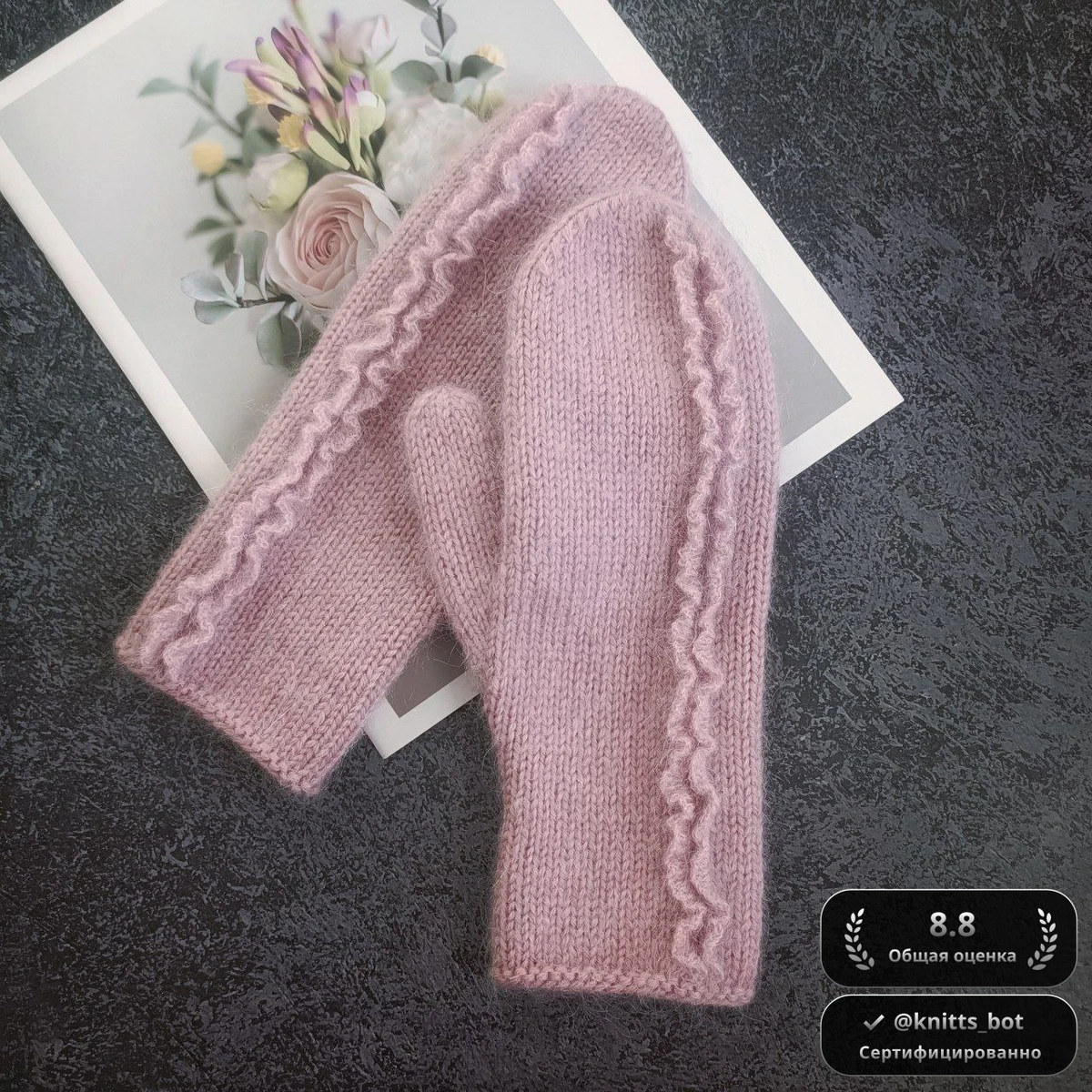 Эти варежки связаны, вероятно, методом кругового вязания круговыми спицами. Использована тонкая мягкая пряжа с добавлением козьего пуха для создания теплоты и уютности изделия. Основной узор выполнен лицевой гладью, что позволяет варежкам плотно прилегать к руке и сохранять тепло. В качестве акцента используется декоративная рюша, которая добавляет изделию оригинальность и проявляет творческий подход автора. Для создания размеров, подходящих для разных рук, можно варьировать количество набранных петель и размер спиц. Такой метод позволяет легко адаптировать изделие под индивидуальные нужды и предпочтения. Применение этого метода требует опыта в равномерном распределении петель по окружности и способности поддерживать плотное вязание для получения аккуратного результата.