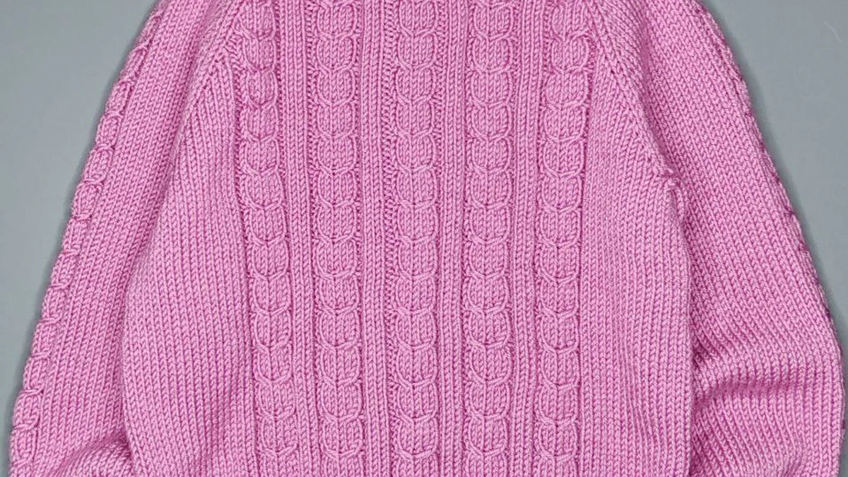 Судя по посадке и линиям плеча, свитер выполнен спицами в конструкции «реглан сверху» (часто вяжут по кругу от горловины). Набор петель начинается с воротника: высокая горловина связана резинкой (вероятнее 2×2) с подворотом, что даёт плотное прилегание и тепло. После воротника переходят к кокетке, размечая регланные линии маркерами и выполняя прибавки в каждом 2-м ряду (или по расчету) для формирования плеч и груди. Для комфортной посадки обычно добавляют росток укороченными рядами по спинке (немецкие/японские укороченные), благодаря чему перед не «задирается», а горловина ложится ровнее. Основное полотно корпуса выполнено лицевой гладью, а по центру переда проходят вертикальные панели жгутов (кос). Перекрещивания выполняют с помощью вспомогательной спицы/булавки для кос, а изнаночные дорожки между панелями подчёркивают рельеф и делают рисунок читаемым. Рукава, судя по фактуре, поддерживают тему центральных кос — по ним идёт рельефная «дорожка» из жгутов или рельефных столбиков петель, а остальная часть — лицевая гладь. После отделения рукавов петли корпуса замыкают в круг и вяжут до низа, завершая широкой резинкой. Манжеты рукавов также выполнены резинкой; закрытие лучше делать эластичным (например, иглой), чтобы край не стягивал. Финальный штрих — ВТО: деликатная стирка/отпаривание через ткань и раскладка по меркам для выравнивания кос и стабилизации формы.
