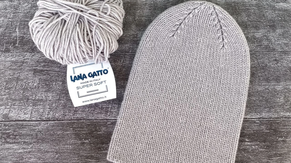 Шапочка связана по кругу без швов, что обеспечивает идеальную посадку и отсутствие громоздких соединительных швов. Для набора петель использован классический длинный хвост, однако при желании подойдёт и итальянский набор, дающий безупречно эластичный край. Полотно выполнено лицевой гладью на чулочных или круговых спицах №3,5–4 мм; пряжа – Lana Gatto Super Soft (100 % extrafine меринос, метраж 125 м/50 г). После набора полотно вяжется по спирали лицевыми петлями до нужной высоты. Далее макушка формируется клиновидными убавками в шести секторах: в каждом секторе выполнены зеркальные убавки «ssk» (снятая, снятая, провязать вместе лицевой за задние стенки) и «k2tog» с одной стороны дорожки из снятых петель. Приём создаёт декоративный, слегка рельефный шов-иллюзию, подчёркивающий геометрию изделия. Для идеальной структуры полотно прошло влажно-тепловую обработку: аккуратное намокание в тёплой воде с деликатным средством для шерсти, затем раскладка на полотенце и выравнивание формы. После сушки петли расправились, а мериносовая пряжа раскрылась, став ещё мягче и воздушнее.