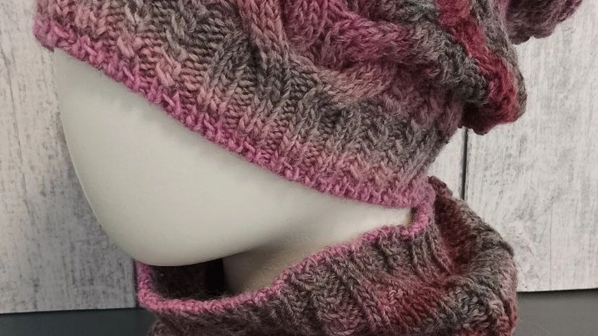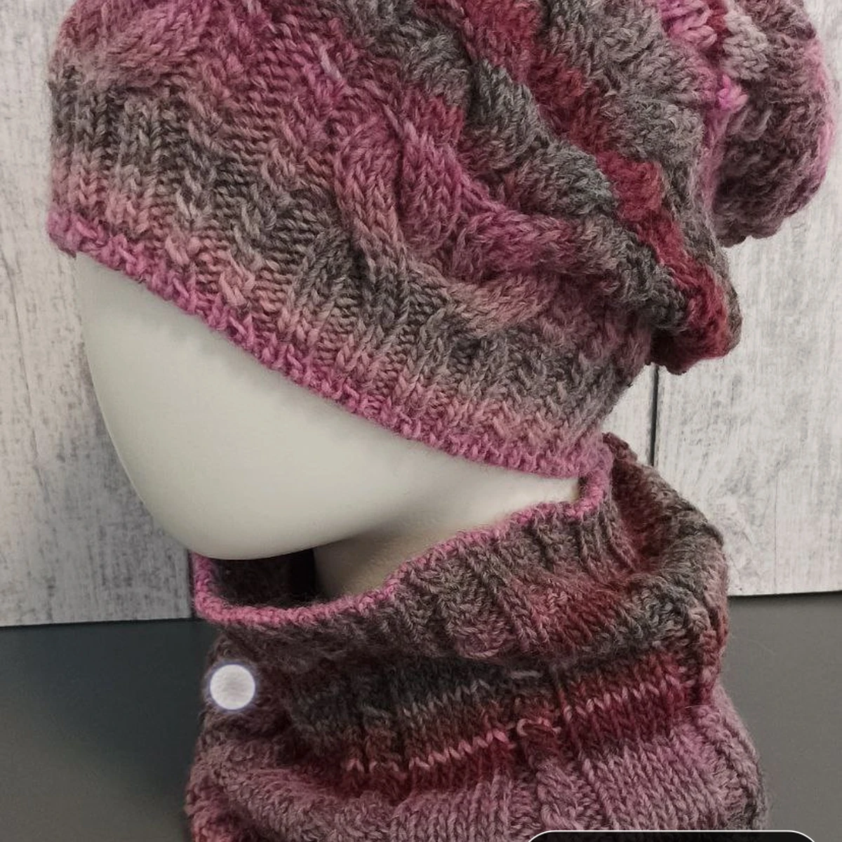 Комплект из объёмной шапочки-«бини» и уютного снуда связан из меланжевой пряжи с плавным переходом ягодно-розовых и серо-тауповых оттенков. Крупные косы на шапке эффектно выделяются за счёт рельефа и подчёркивают градиент цвета, а резинка 1×1 по краю обеспечивает плотное, но комфортное прилегание. Снуд выполнен резинкой 3×1 с повторяющимися цветовыми полосами, застёгивается на декоративную пуговицу – практичная деталь, облегчающая надевание. Полотно ровное, петли аккуратные, переходы цвета мягко растворяются друг в друге, создавая тёплый, «туманно-ягодный» эффект. Фотография чёткая, нейтральный фон подчёркивает фактуру и оттенки изделия.