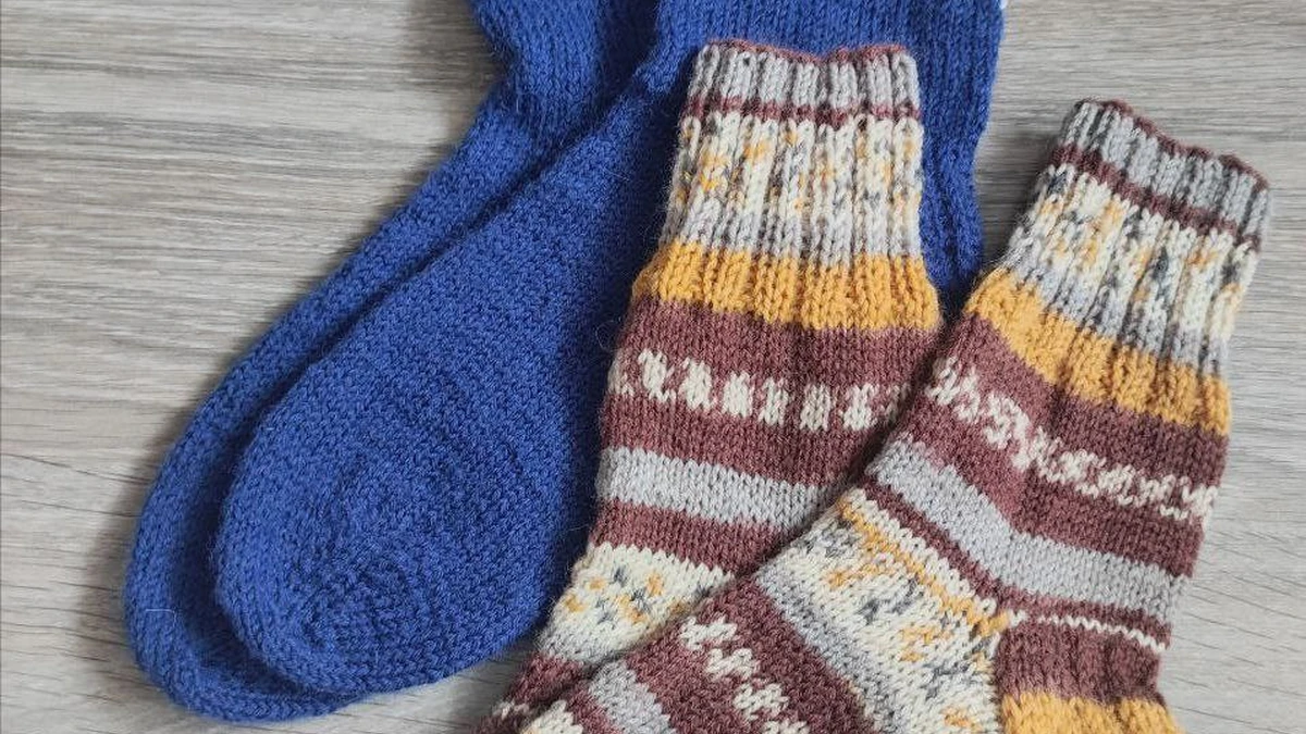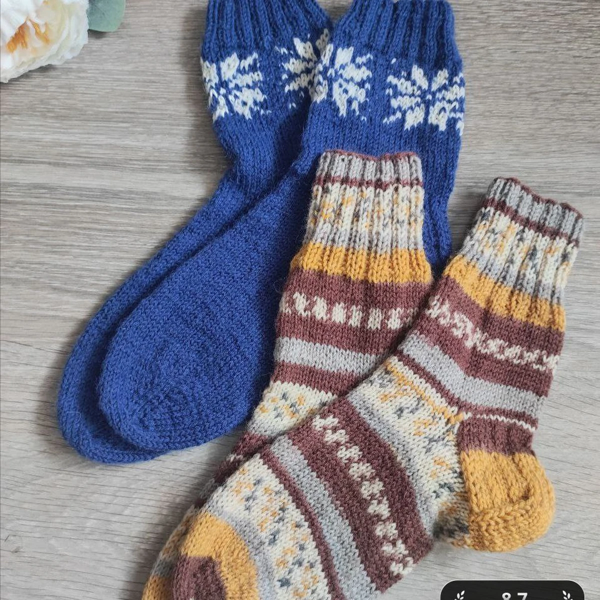 На фотографии представлены две пары вязаных носков, которые обладают своей индивидуальностью и обаянием. Первая пара имеет насыщенный синий цвет с белыми снежинками, добавляющими зимнее настроение. Вторая пара выполнена в тёплых осенних цветах, включая коричнево-жёлтые полосы и оригинальные узоры.