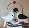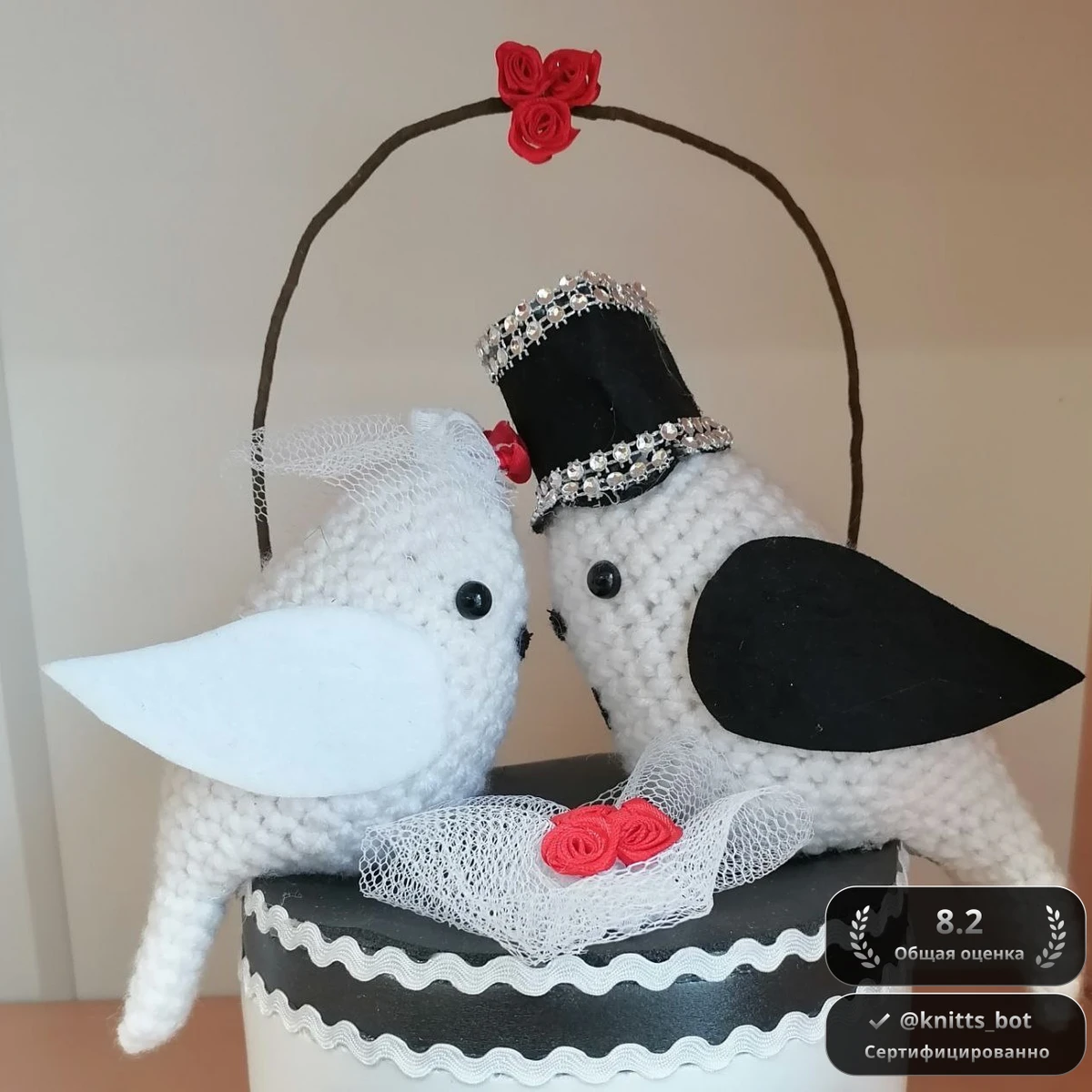 Перед вами очаровательная пара свадебных голубков-амигуруми, грациозно склонившихся друг к другу над миниатюрным «тортиком». Тельца связаны плотными столбиками без накида, благодаря чему форма птичек держится чётко и аккуратно. Невеста украшена лёгкой фатой из тонкой сеточки, а жених – цилиндром с блестящим стразовым обрамлением и чёрным фетровым крылом. Белоснежная пряжа контрастно подчёркивает детали: чёрные бусины-глазки, фетровые крылышки и яркие алые розочки из атласной ленты. Волнообразная тесьма по краю подставки добавляет игривую отделку, а дуга из проволоки с красными розами обрамляет композицию, придавая ей завершённость и праздничный шарм.