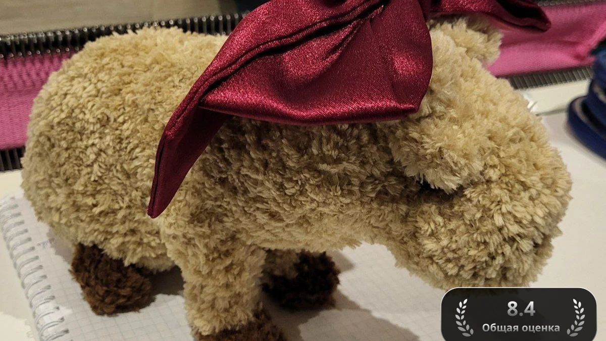 Игрушка связана крючком №4 из плюшевой микрополиэстеровой пряжи в технике классического амигуруми по спирали без соединительных столбиков, что позволяет избежать видимых швов и делает поверхность идеально ровной. Тело выполняется единым полотном: после кольца амигуруми вяжутся ряды столбиков без накида с равномерными прибавками до овального основания. Далее полотно вяжется без прибавок, формируя «бочонок», затем с убавками закрывается верх. Лапы вывязываются отдельно, начиная с коричневой пряжи кольцом амигуруми, переходят на основной цвет и ввязываются в тело за заднюю стенку петель для устойчивости. Голова провязывается аналогично, но с более выраженным расширением в лобной части и лёгкой утяжкой глазниц при помощи нити той же толщины, чтобы подчеркнуть объём. Ушки вяжутся в форме маленьких плоских овалов и пришиваются трикотажным швом «за обе стенки», создавая аккуратный переход без ступенек. Все детали плотно набиваются холлофайбером слоями, с перекрёстными швами для фиксации. Глазки-пуговки пришиваются потайным швом с обратной стороны, нить закрепляется внутри. Завершающим штрихом служит атласная лента 4 см шириной, закреплённая узлом «двойной бантик» и пришитая несколькими невидимыми стежками к макушке для надёжности даже при машинной стирке. Приём «утопленного узелка» используется для маскировки сдвоенных убавок, а крайние петли каждого ряда подтягиваются иглой, чтобы пряжа лёгкими колечками равномерно закрывала основу, создавая впечатление натуральной овечьей шерсти.