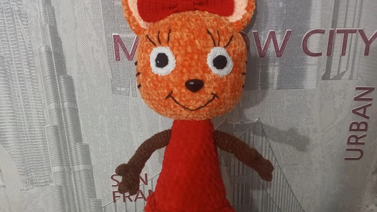 Очаровательная амигуруми-кошечка сразу притягивает взгляд своим ярким апельсиновым мехом и кокетливым красным бантом. Плюшевая велюровая пряжа делает мордочку и платьице особенно мягкими и приятными на ощупь. Большие вышитые глазки придают персонажу живое, мультяшное выражение, а тонкие коричневые лапки, хвостик с полосками и аккуратные ушки завершат образ. Чёткие прибавки и убавки формируют ровную, безступенчатую фигуру, благодаря чему игрушка выглядит аккуратно и профессионально. Платье вывязано отдельным полотном с рюшей по краю, что добавляет игривости и динамики всему образу.