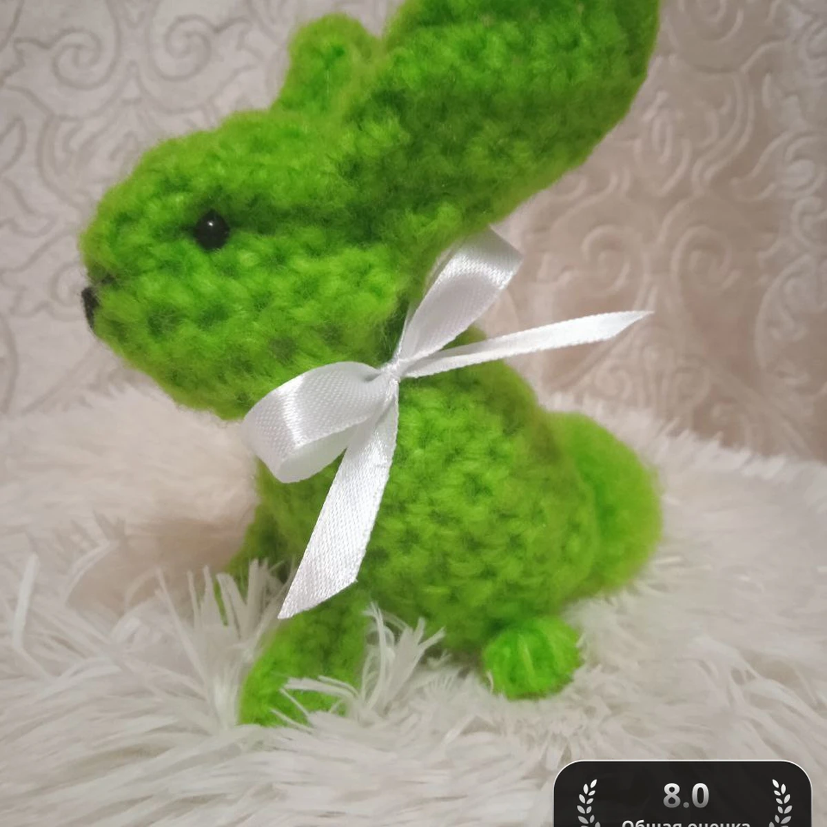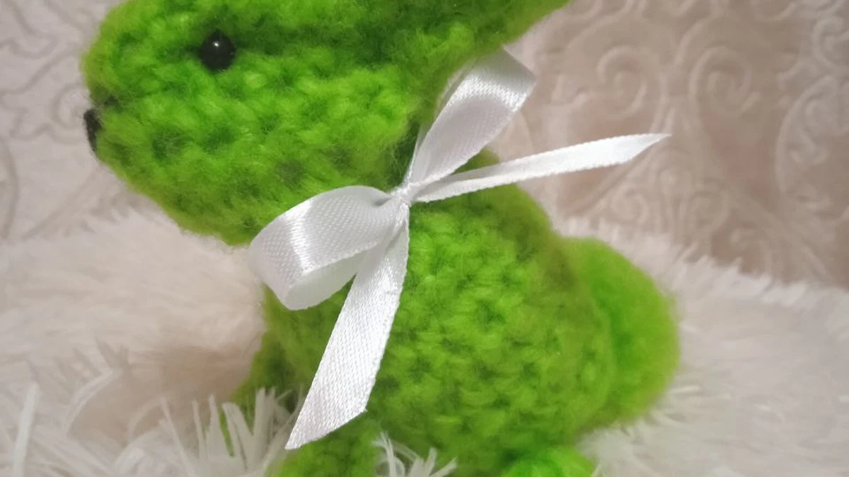 Это милое вязаное изделие представляет собой кролика выполненного в ярко-зеленом цвете с аккуратным белым бантиком на шее. Игрушка выполнена из пушистой пряжи, что придаёт ей мягкость и уютную текстуру, идеально подходящую для детей. Эта работа вызывает улыбку и радость, добавляя яркость в любой интерьер.