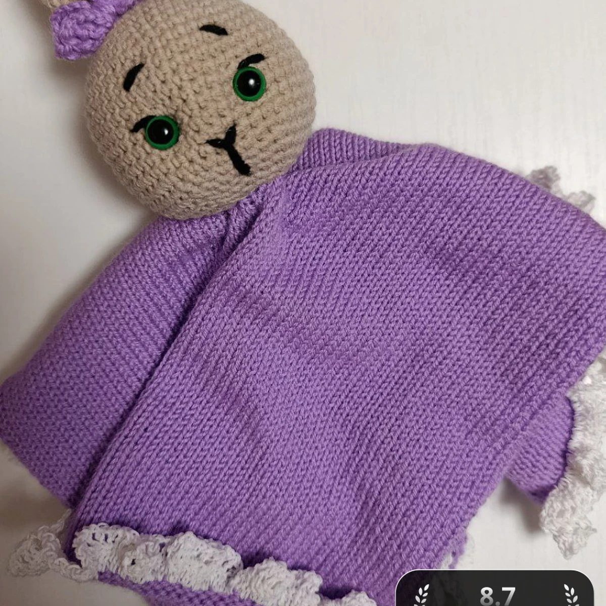 На фото очаровательная игрушка-комфортер: зайка с вязаным (спицами) фиолетовым «платьицем/тельцем» и крючковой головой в стиле амигуруми. Лицевая гладь смотрится ровно и аккуратно, форма полотна хорошая, а белая кружевная обвязка по краю добавляет нежности и «кукольности». Мордочка оформлена вышивкой, глазки — безопасные с зелёным ободком; сверху милый бантик. Образ очень цельный: спокойный беж + лаванда — удачное сочетание для детской темы.