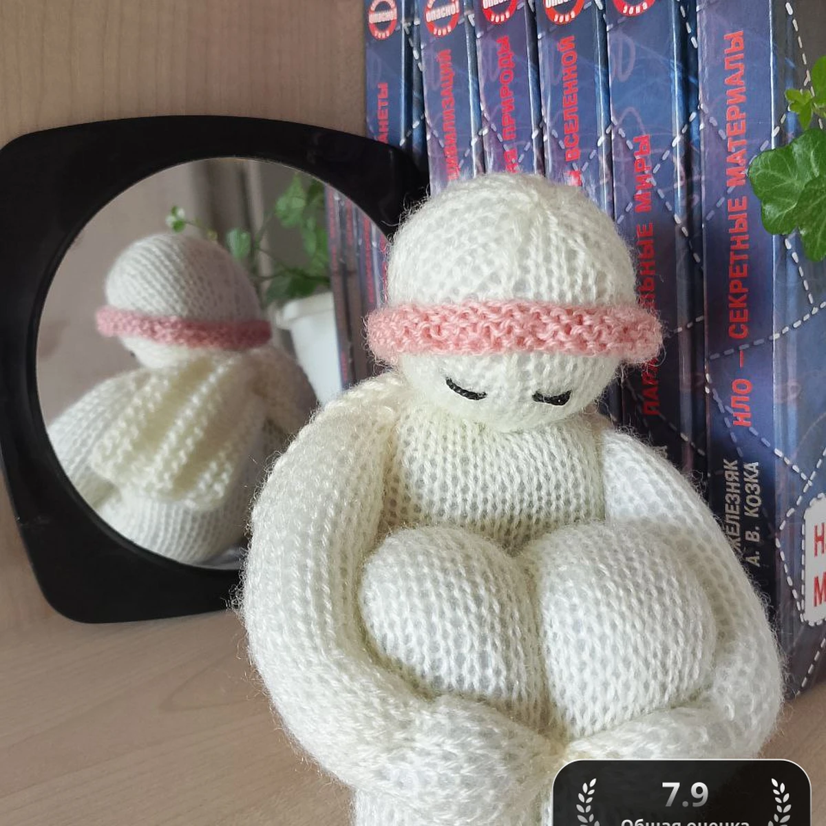 Очаровательная вязаная кукла-скульптура словно сидит в позе лотоса, обхватив пухлые коленки длинными мягкими ручками. Молочно-белая пряжа с лёгким пушком создаёт ощущение облачности и нежности, а розовая фактурная повязка на голове добавляет милый акцент. Чётко сформированные шарообразные формы ножек и ручек демонстрируют аккуратную вязку лицевой гладью, благодаря которой поверхность получается ровной и упругой. Закрытые вышитые глазки придают игрушке умиротворённое, медитативное выражение. В целом работа производит впечатление минималистичной и очень уютной декоративной фигурки, идеально подходящей для подарка или домашнего декора.