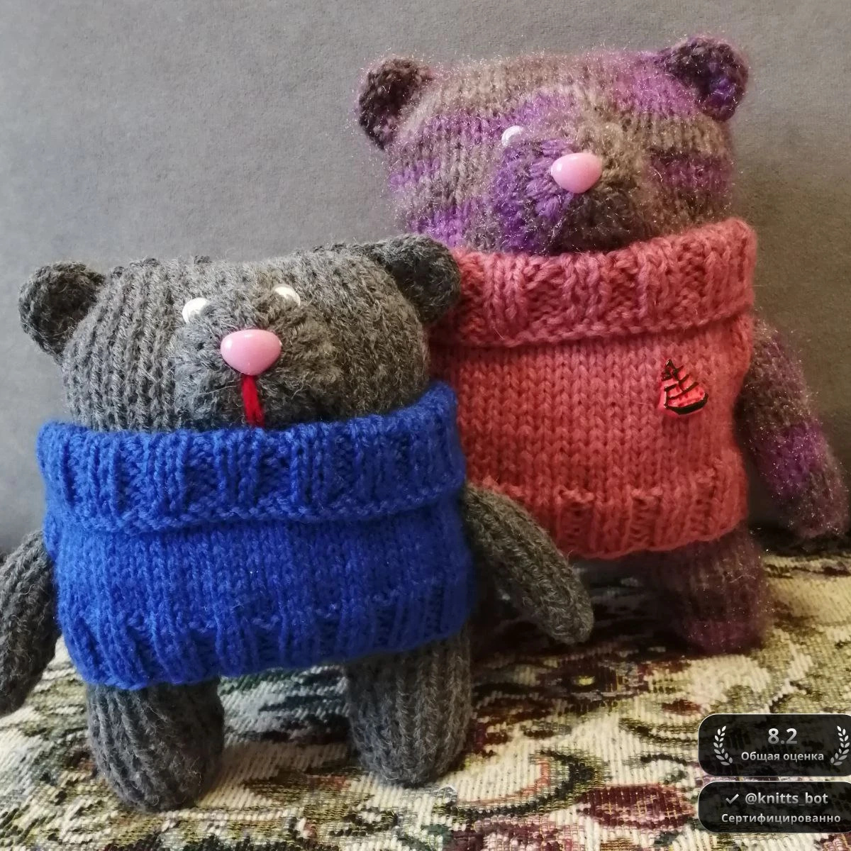 На фото представлены две очаровательные вязаные игрушки в виде медведей. Первый медвежонок одет в яркий синий свитер, а второй в стильный розово-фиолетовый наряд с милой аппликацией. Эти игрушки выглядят очень уютно и вызывают желание обнимать их. Отличный подарок для детей и взрослых, любящих творческие изделия ручной работы.