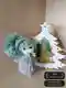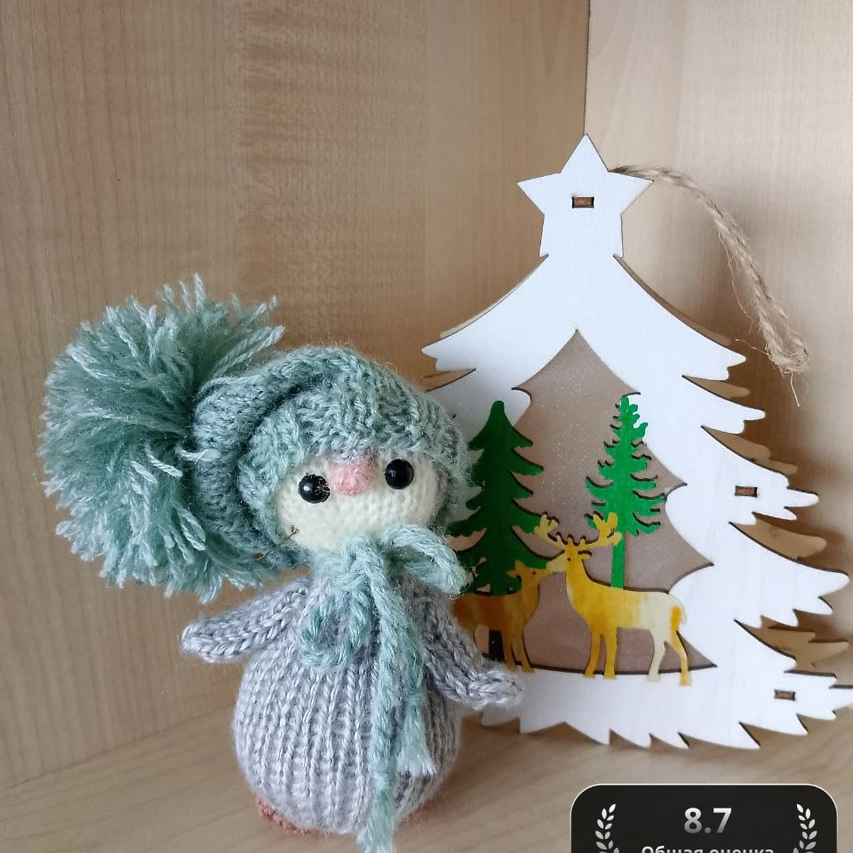 На фото — очаровательная вязаная мини-игрушка в зимнем образе: серое тельце «капелькой», мятная шапочка с большим пушистым помпоном и длинный шарфик с кисточками. Личико аккуратное, с безопасными глазками и мягким румянцем/носиком, по бокам видны маленькие «крылышки», что делает персонажа похожим на ангелочка. Цветовая гамма очень нежная: холодный серый красиво поддерживает мятный, работа выглядит уютно и по‑зимнему. На заднем плане декоративная ёлочка с оленями усиливает атмосферу, хотя свет чуть плоский и фон можно сделать более «продающим».