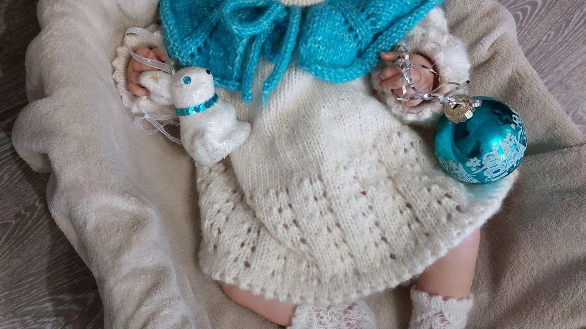 Платье связано лицевой гладью с ажурными вставками, что придаёт изящность и воздушность изделию. Манишка выполнена полупатентной резинкой, которая создаёт лёгкий объем и текстуру. Для манжетов и отделки использована техника платочной вязки для достижения аккуратного завершения. Носочки также выполнены с элементами ажурного узора, что добавляет элегантности и утонченности всей композиции. В процессе вязания использовались круговые и чулочные спицы, что обеспечивает равномерное натяжение нитей и упрощает работу с мелкими деталями. Основное внимание уделено плотности вязания для достижения желаемой формы и комфорта при ношении. Цветовые переходы осуществлены с помощью смены нитей, что позволяет сохранить чистоту линий и завершенность образа.