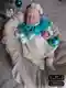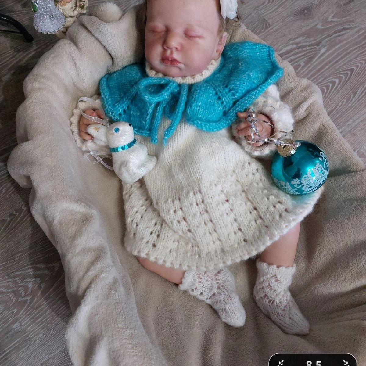 На фотографии изображена замечательная кукла в вязаном наряде. Вязаная одежда включает в себя белый платье и голубой манишка. Каждый элемент выполнен очень аккуратно, создавая нежный и уютный облик. Голубой цвет манишки удачно сочетается с белой пряжей, создавая восхитительный контраст. Завершают ансамбль восхитительные носочки с ажурным узором и мягкая головка в форме цветка.