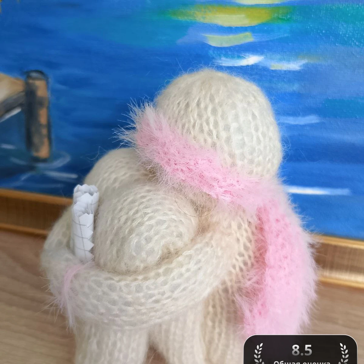 Очаровательный объёмный «обнимашка» связан из воздушной, пушистой ангоро-мохеровой пряжи молочного оттенка и носит нежный розовый шарфик из фактурного травяного «пуха». Игрушка словно складывает лапки-ручки в тёплом объятии и прижимает свиток послания, добавляя милый, трогательный штрих. Округлые формы, мягкая фактура и пушистая дымка придают созданию уют и нежность, а контрастный шарфик подчёркивает характер и делает композицию завершённой. Работе удаётся объединить современный минималистичный дизайн и классическую пушистую текстуру, создавая эффект «комочка тепла», который так и хочется прижать к щеке.