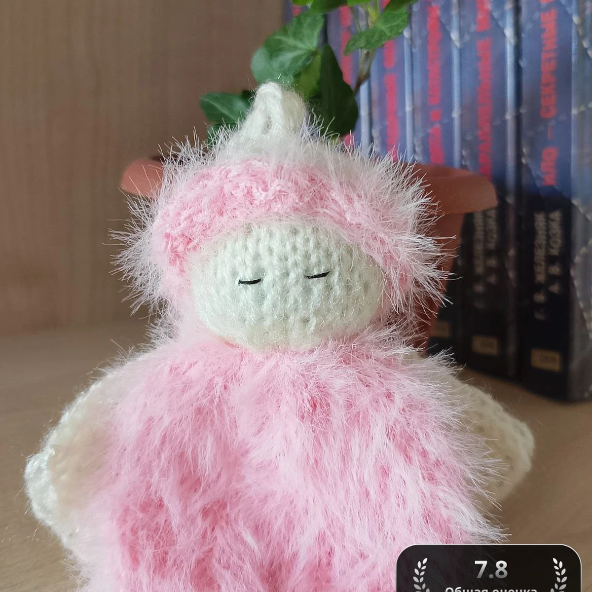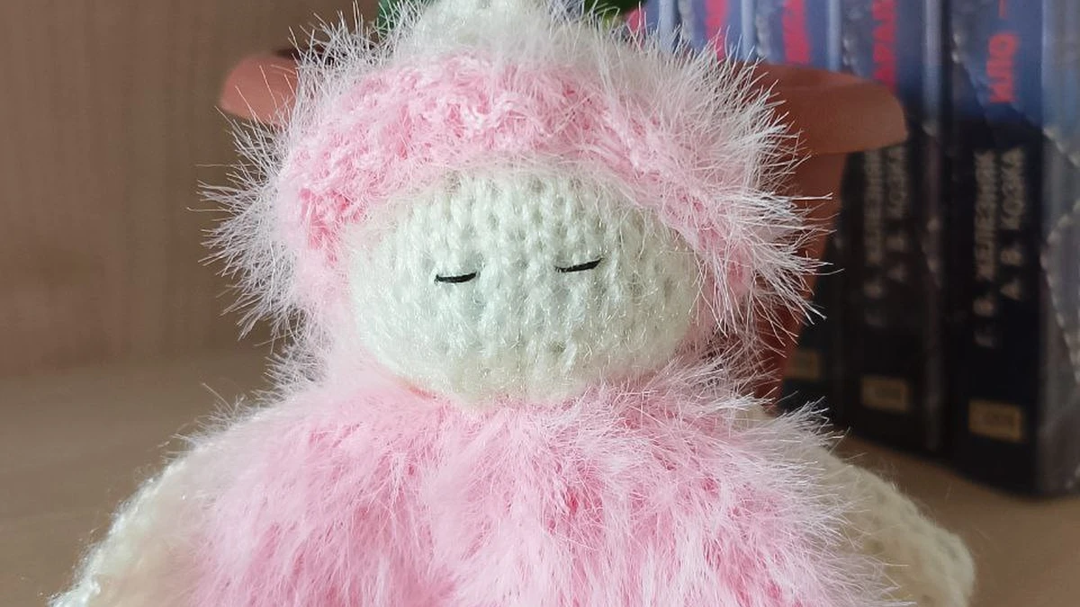 Очаровательная мини-куколка-соня связана в технике амигуруми и окутана облачком нежно-розовой «травки». Кремовая головка с аккуратным верхним узелком и вышитыми закрытыми глазками придаёт образу умиротворённость. Пышная розовая шубка контрастирует с гладкими крылышками из пряжи молочного оттенка, создавая игру текстур: шелковисто-пушистая «травка» переливается на свету, а плотные столбики без накида головы и крыльев подчёркивают форму. Игрушка выглядит уютно и нежно — идеальный компаньон для детских снов и мягкий декор детской комнаты.