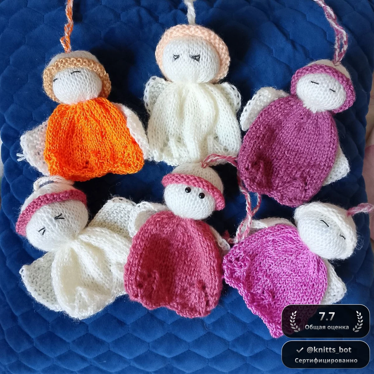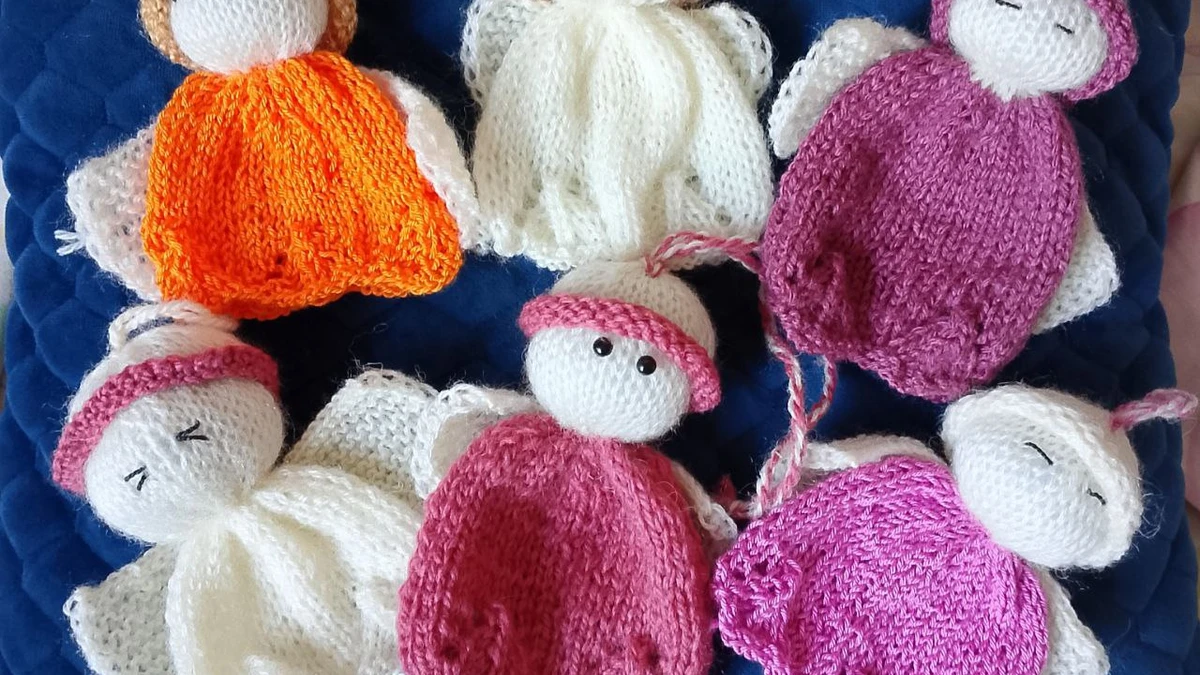 Нежная стайка из шести маленьких ангелочков-подвесок: каждый – миниатюрная кукла с круглой белоснежной головкой, мягкими крылышками-ажурами и свободно драпирующимся платьицем. Платья выполнены чулочной гладью в разных тонах: ярко-оранжевый, молочно-белый, розово-сливовый, фуксия и два ягодных градиента; головы и крылья связаны из пушистого белого акрила с лёгким мерцающим ворсом. Лица у троих лишь намечены спящими глазками стежком «Назад иголку», у троих прорисованы чёрные глазки-бисеринки – милое разнообразие характеров. На макушке каждого – витой шнурок для подвешивания на ёлку или в детскую комнату. Игрушки лёгкие, упругие, приятно держать в руках, а разноцветная гамма создаёт радостное настроение праздника.