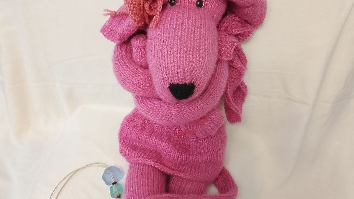 Очаровательная «Розовая пантера» в вязаном исполнении — узнаваемый образ с длинными лапками и вытянутой мордочкой, выполненный в розовой гамме. Интересно обыгран головной убор и декоративные элементы: бусины и аккуратная «носик»-вставка из тёмной пряжи. Фактура в основном лицевая гладь, за счёт чего игрушка выглядит мягкой и «тактильной». Видно, что работа собрана вручную и задумка сильная, но местами не хватает шлифовки: заметны точки крепления деталей и небольшая неоднородность натяжения, а в кадре отвлекают булавка и фон с заломами.