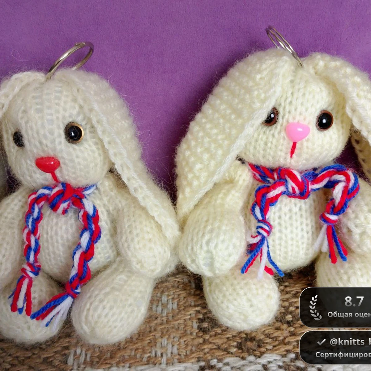 Две очаровательные мини-зайки-брелока связаны из мягчайшей кремовой пряжи ангорового типа: округлые тельца, пухлые лапки и длинные, трогательно свисающие ушки сразу вызывают улыбку. Контрастные глазки-пуговки придают живость, а розовые носики и вышитые ротики добавляют милое выражение мордочке. Патриотичные косички-шарфики из красных, синих и белых нитей акцентируют образ и задают яркий ритм. Металлические кольца кольца-держатели превращают игрушки в удобные брелоки — их можно повесить на рюкзак, сумку или ключи.