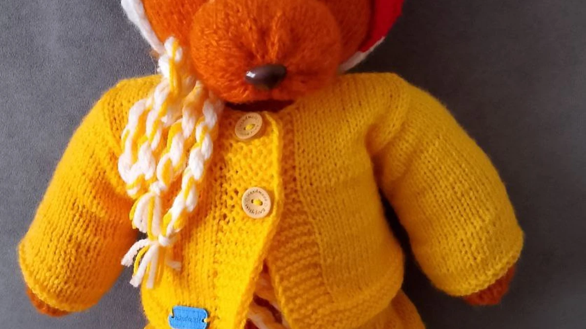 На фотографии изображен великолепно связанный плюшевый мишка ручной работы. Его яркий костюм выполнен из желтой пряжи и радует глаз насыщенной цветовой палитрой. Декоративные элементы, такие как цветок на головном уборе, придают изделию особую выразительность и индивидуальность.
