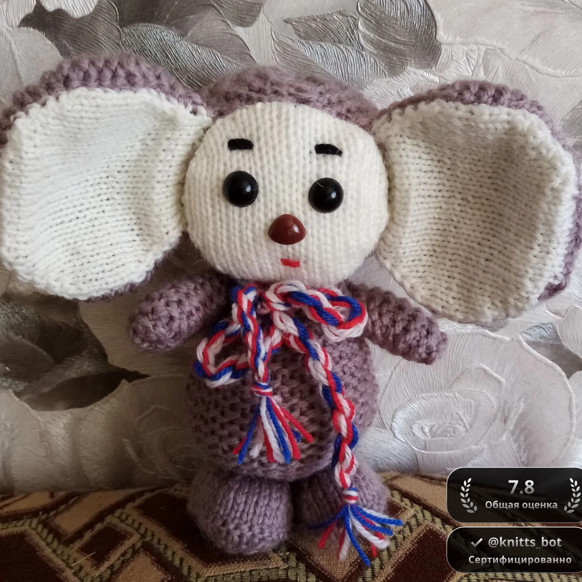 Этот милый вязаный персонаж с большими ушами и забавным шарфиком, выполненный в нежных оттенках, вызывает настоящую улыбку. Личико игрушки привлекательно и выразительно, а трёхцветный шарф добавляет яркий акцент. Игрушка идеально подходит для подарков детям или просто для украшения интерьера.