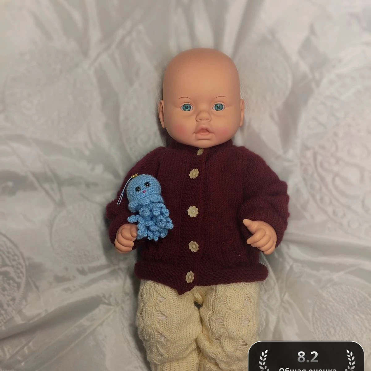 Очаровательная кукольная парочка: тёплый бордово-ягодный кардиган с аккуратной планкой на цветочных пуговках, кремовые брюки с выразительными косами и нежной ажурной дорожкой, а в ручках – крошечный бирюзовый осьминожка-амигуруми. Мягкая фактура полушерстяной пряжи создаёт уют, ажуры на штанишках добавляют воздуха, а яркий контраст игрушки оживляет композицию. Всё выглядит тщательно продуманным, гармоничным и согретым заботой мастера.
