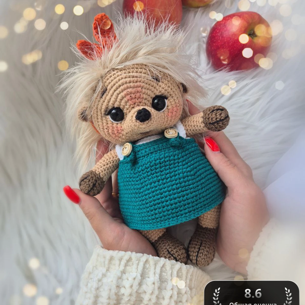 Милейший амигуруми-ёжик с пушистой гривкой выглядит так, будто только что выпал из осенней сказки. Туловище связано из тёплого карамельного оттенка, щёчки тонировкой лёгко розовеют, придавая озорной вид. Крупные блестящие глазки и маленькая чёрная мордочка делают личико выразительным. Изюминка образа – ярко-бирюзовое сарафан-трапеция, связанный плотными столбиками без накида и украшенный крошечными деревянными пуговками. На макушке – оранжевый листочек-бантик, подчёркивающий осеннее настроение. Аккуратные лапки с вышивкой пальчиков завершают композицию. Работа выглядит цельной, аккуратной и дарит ощущение уюта и тепла.