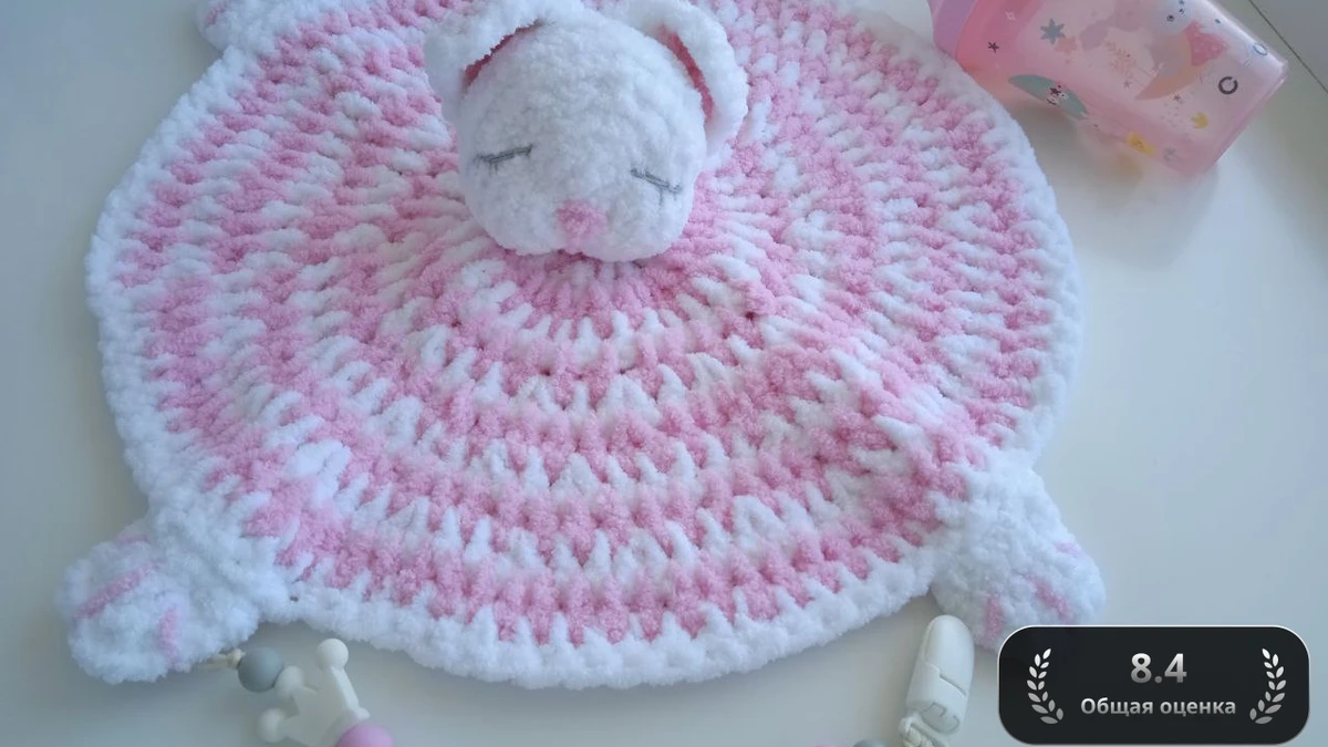 Комфортер выполнен крючком №4 из гипоаллергенной микроплюшевой пряжи (аналог Himalaya Dolphin Baby). Работа начинается с магического кольца амигуруми: в кольцо провязаны 12 столбиков с накидом, далее круг растёт классической схемой: в каждом новом ряду количество столбиков удваивается согласно формуле 12n. После шестого ряда мастер чередует два оттенка пряжи каждый ряд, создавая аккуратную спираль. Чтобы рисунок выглядел ровно, смена цвета делается в последнем протягивании петли, а нити незаметно переплетаются внутри. По достижении нужного диаметра (≈28 см) обвязка завершается полустолбиками, фиксирующими край. Головка зайки связана по схеме амигуруми: 6 сбн в кольцо, далее равномерные прибавки до 42 петель, 5 рядов без прибавок, затем убавки с наполнением холлофайбером. Ушки — овальные лепестки на основе полуовальных рядов сбн; пришиты матрасным швом. Лапки формируются как мини-овал из 6 рядов, набиваются и пришиваются в четырёх «углах». Глазки и нос вышиты тонким хлопком, чтобы исключить мелкие детали. Завершающим штрихом становится пришивная петелька, к которой крепится силиконовый держатель с бусинами.