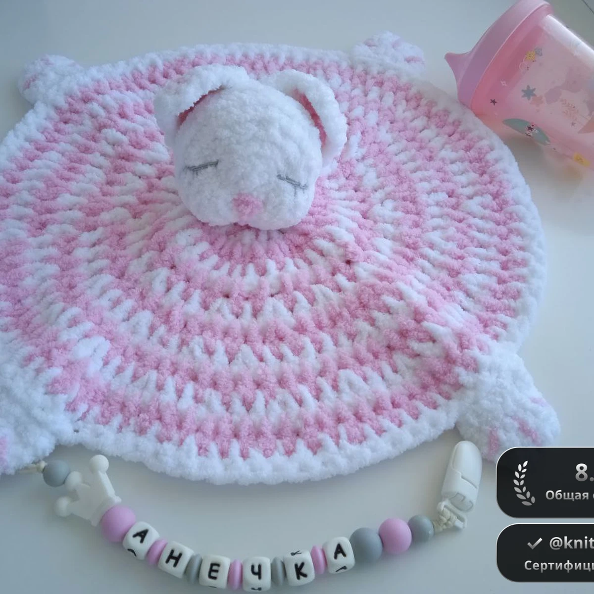 Очаровательный плюшевый комфортер-зайка создан из воздушно-мягкой микроплюшевой пряжи в нежной бело-розовой гамме. Круглое «солнышко» тела вывязано чередованием столбиков с накидом, образующих лёгкий спиральный эффект, а по краям — четыре аккуратные лапки-«уголка». В центре уютно устроилась набивная головка зайки с закрытыми вышитыми глазками и трогательным носиком-пятачком; ушки слегка отогнуты, добавляя живости образу. Дополняет набор силиконовый держатель-грызунок с именем «Анечка», гармонирующий по оттенкам с пряжей. Изделие выглядит невероятно мягким, безопасным и притягивает тактильно, словно облачко, — идеальный спутник для малышей.