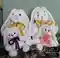 На фотографии изображены милые связанные крючком зайцы с длинными ушами, каждый из которых украшен ярким бантиком. Большие зайцы с золотыми ленточками, а маленькие – с фиолетовой и оранжевой. Белая пряжа делает их особенно мягкими и уютными на вид, а разноцветные носики добавляют забавности и индивидуальности каждому.