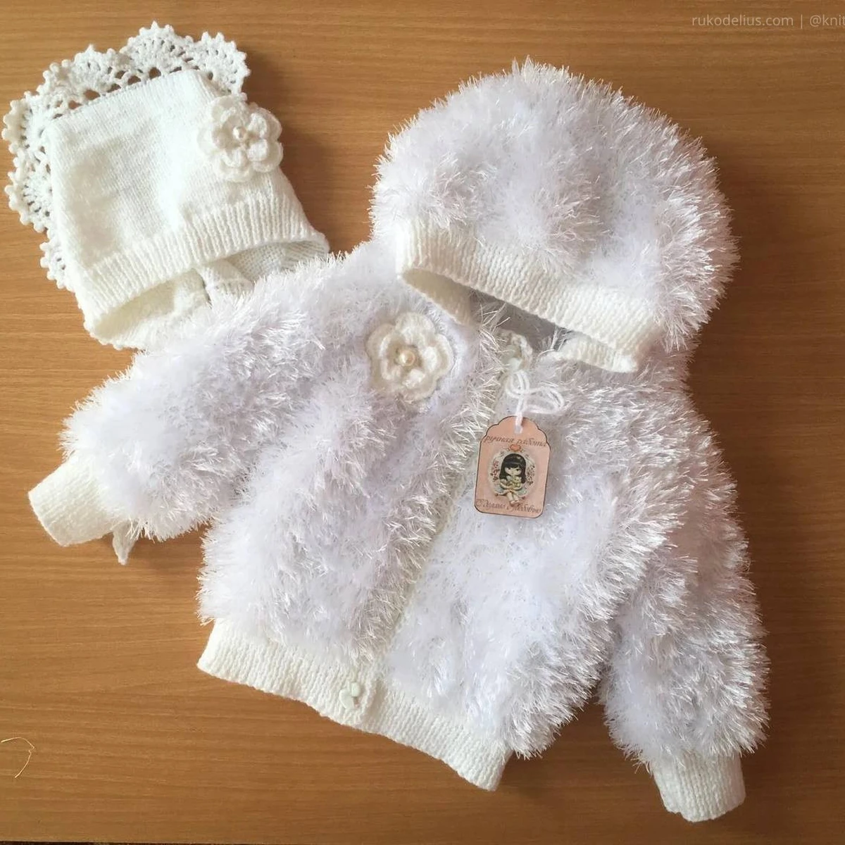 Нежный детский комплект «на выписку»: пушистая кофточка из пряжи «травка» в молочно‑белой гамме и две шапочки — гладкая и чепчик с ажурной каймой. Манжеты и планки связаны ровной резинкой, за счёт чего изделие держит форму и выглядит аккуратно. Декор в виде цветка добавляет «нарядности», а фактура пушистой нити даёт эффект облачка. Работа добротная и уютная, но из-за ворса качество петель читается хуже, а дизайн скорее классический, чем авторский.