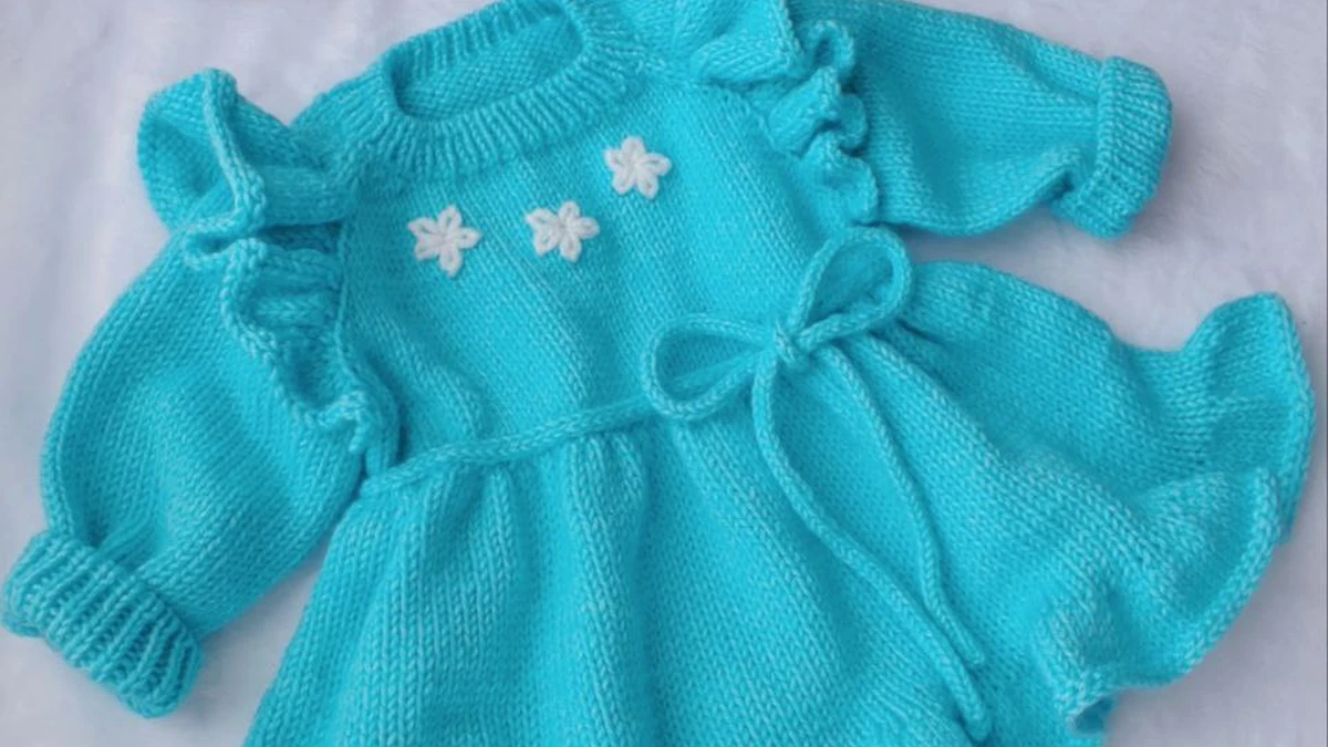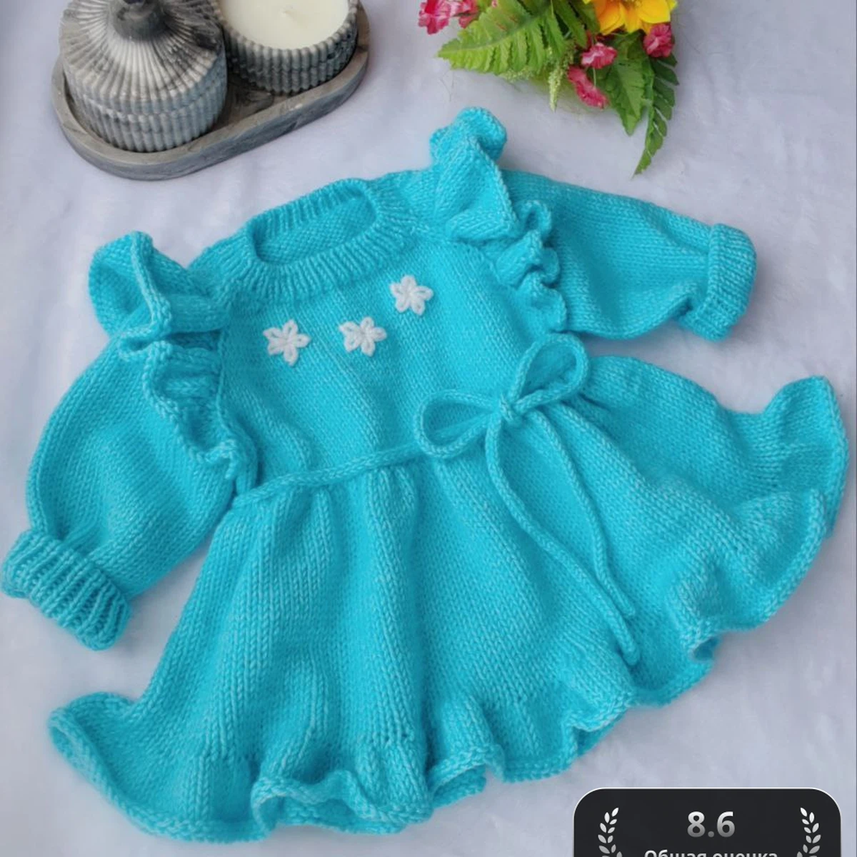 Это очаровательное вязаное платье для малыша в сказочном бирюзовом цвете. У него есть милые рюши на рукавах и подоле, что добавляет женственности и игривости. Украшенное нежными белыми цветочками на груди, платье выглядит волшебно и привлекательно. Отлично подходящее для особых случаев или фотосессий, это платье станет замечательным дополнением к гардеробу маленькой модницы. В композицию фотографии добавлены элементы декора, которые подчеркивают нежность и уют изделия.