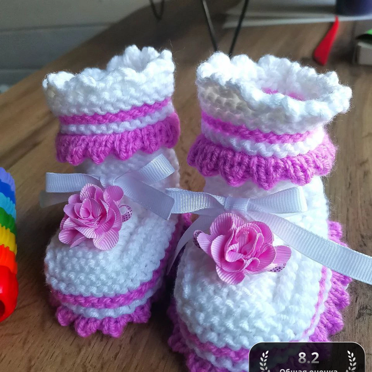 Эти очаровательные вязанные сапожки для малышей выделяются своими яркими бело-розовыми оттенками и замечательным декором в виде маленьких цветочков. Нежное кружево по краям и аккуратные бантики добавляют изделию особую элегантность, создавая ощущение сказочности и радости. Они идеально подойдут в качестве подарка для новорождённого и станут замечательным аксессуаром для фотосессии.