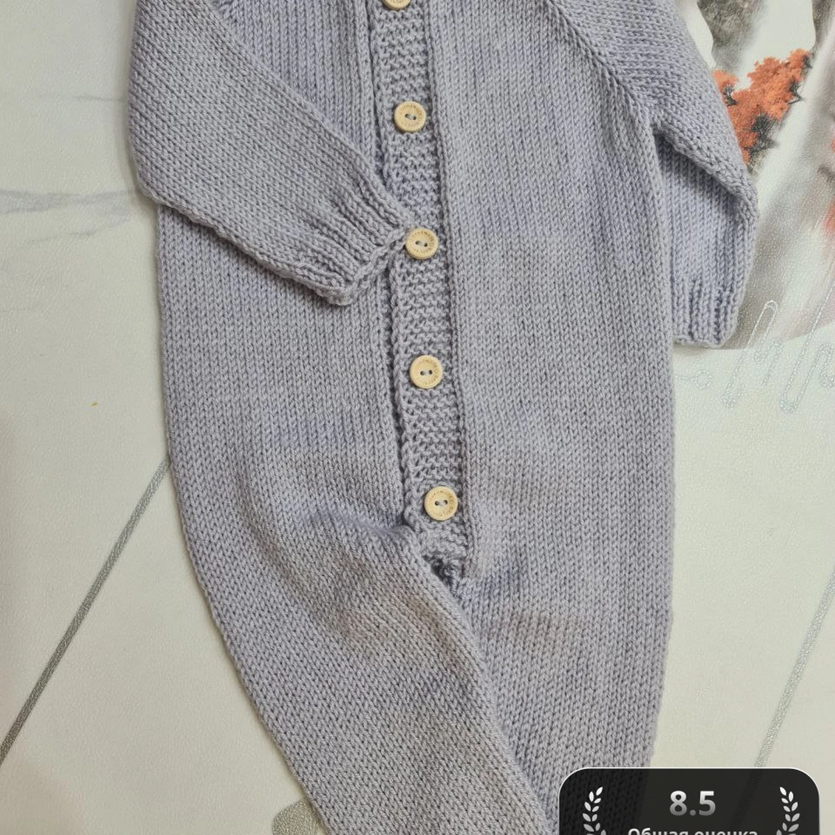 Комбинезон связан методом реглана, используемого для создания целостных изделий без швов. В процессе вязания использована техника лицевой глади для основного полотна и резинки на манжетах и воротнике. Реглановые прибавки выполнены с помощью накидов, образуя аккуратные линии и добавляя изделию декоративные элементы. Петли аккуратно проработаны, что свидетельствует о внимании к деталям и опыте мастера. Вязание начато снизу вверх, с последующим разделением на переднюю и заднюю части, а также рукава вяжутся отдельно, после чего все части соединяются вместе. Дизайн включает лицевые и изнаночные петли, что добавляет изделию уютности и делает его подходящим для малышей. Прочные и удобные кнопки обеспечивают легкость использования, а эластичная резинка гарантирует комфорт ребенку. Эти особенности подчеркивают мастерство и творческий подход автора.